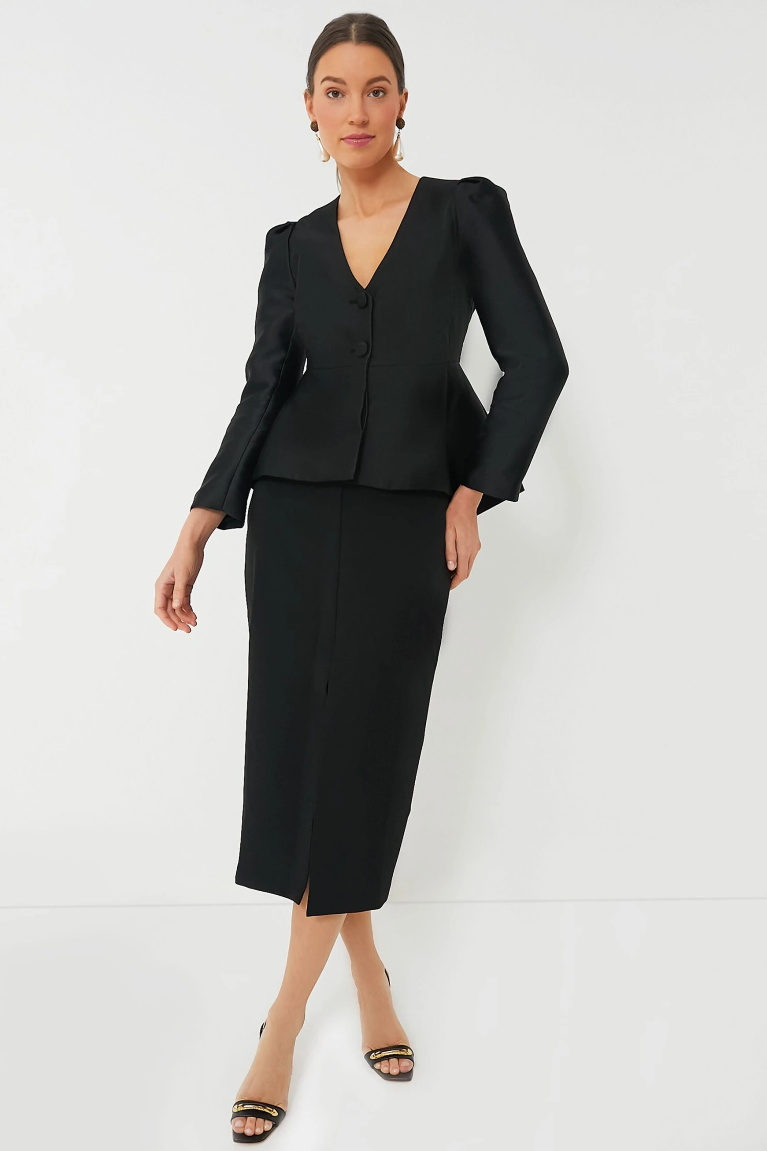 The Black Louna Midi Skirt is a sophisticated number perfect for cocktail parties, dinner dates, or days in the office. A pencil silhouette with a chic front slit allows for a sleek line without compromising ease of movement. Pair with a white button down and flats, or a flirty blouse and heels!