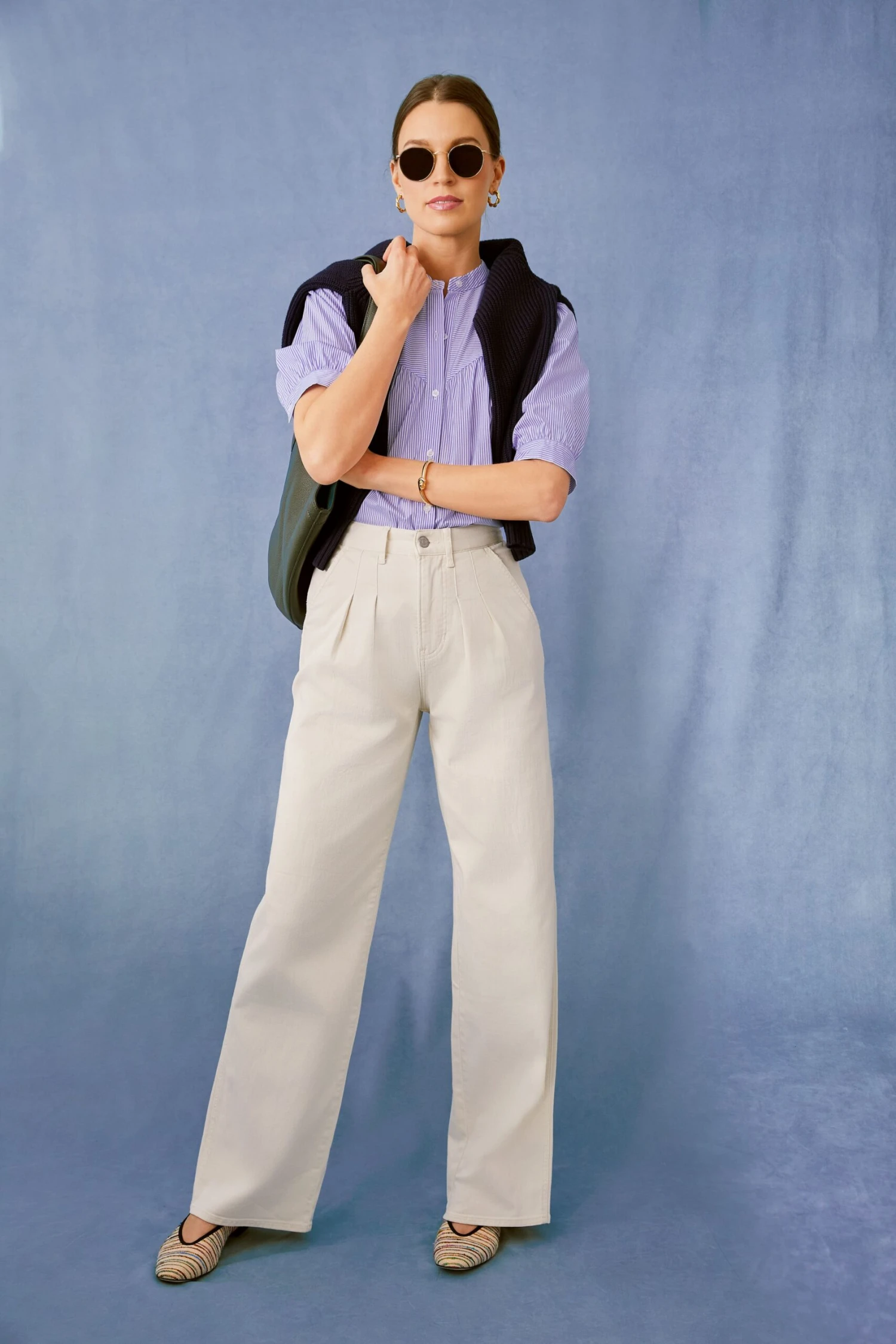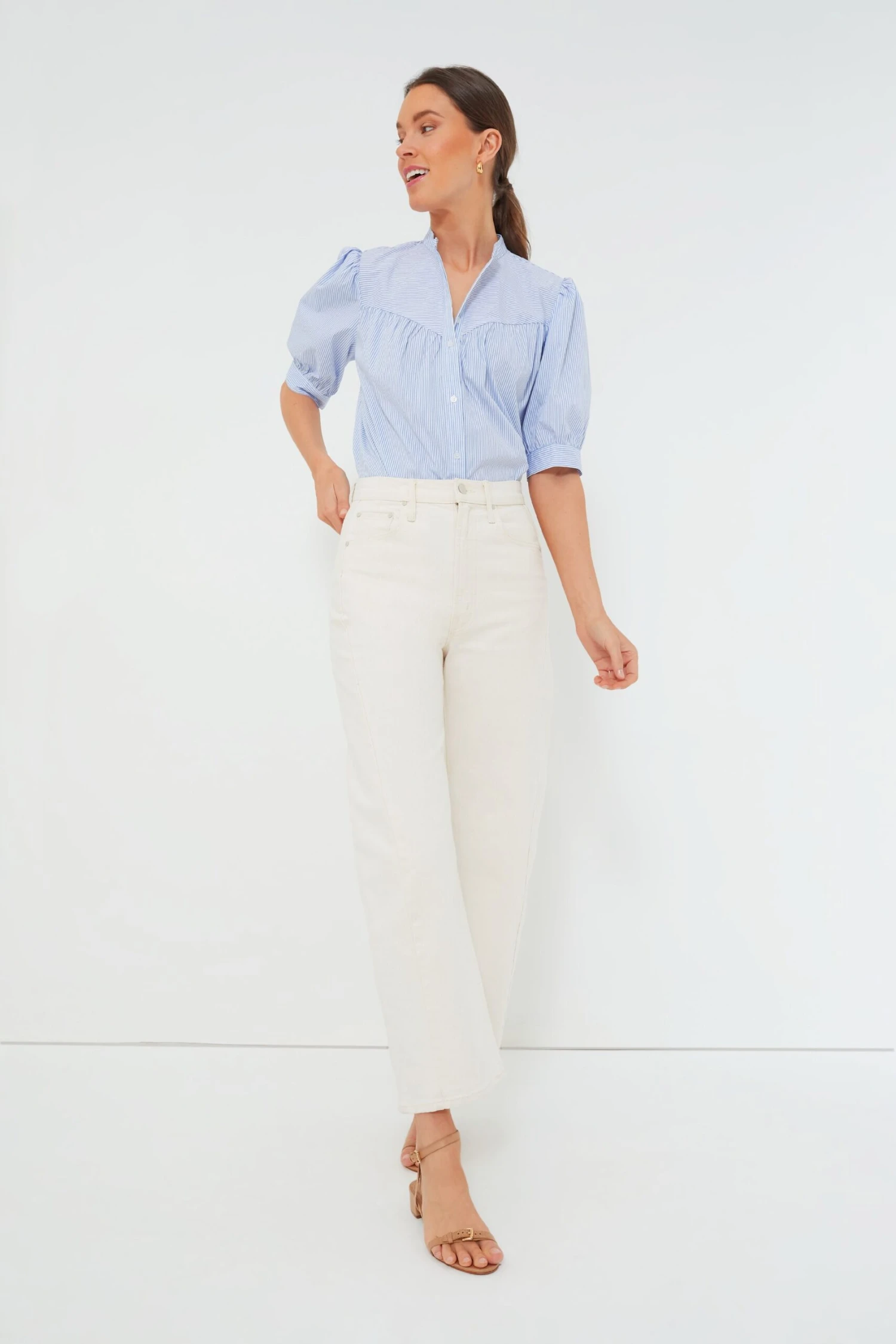 The Shirt by Rochelle Behrens has done it again with another closet staple that you will find yourself wearing day in and day out. With short puff sleeves, a gathered seam on the chest, and a classic blue and white striped pattern, this is a perfect transition piece between the cold and warm months. Pair with trousers and loafers for a day in the office, or with denim and sneakers for a day running errands!