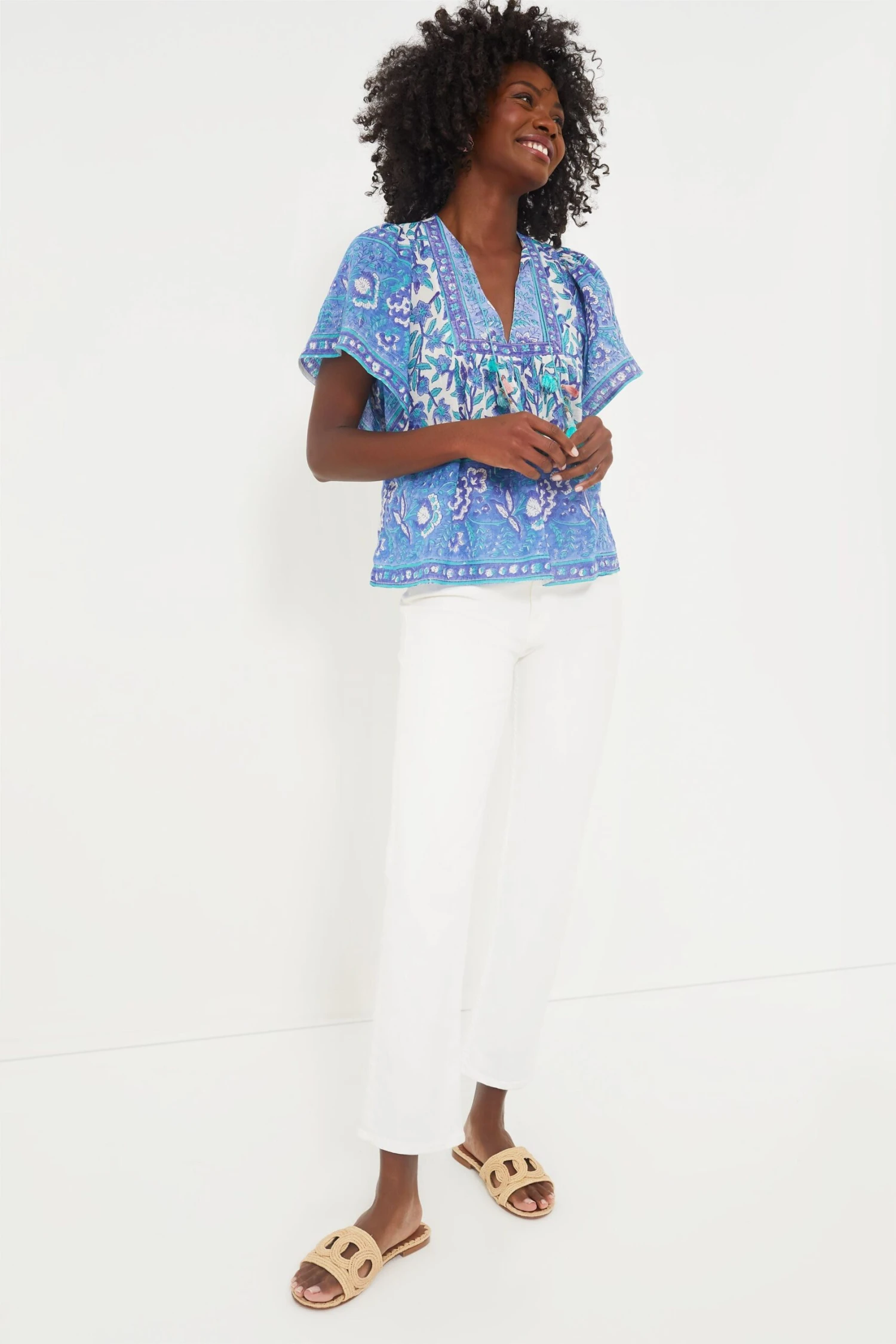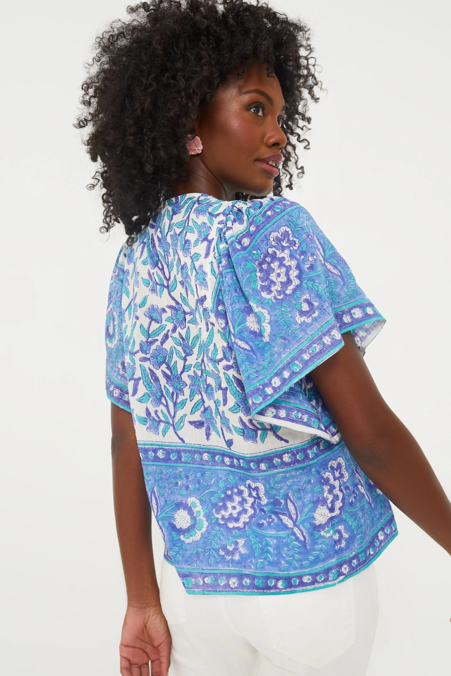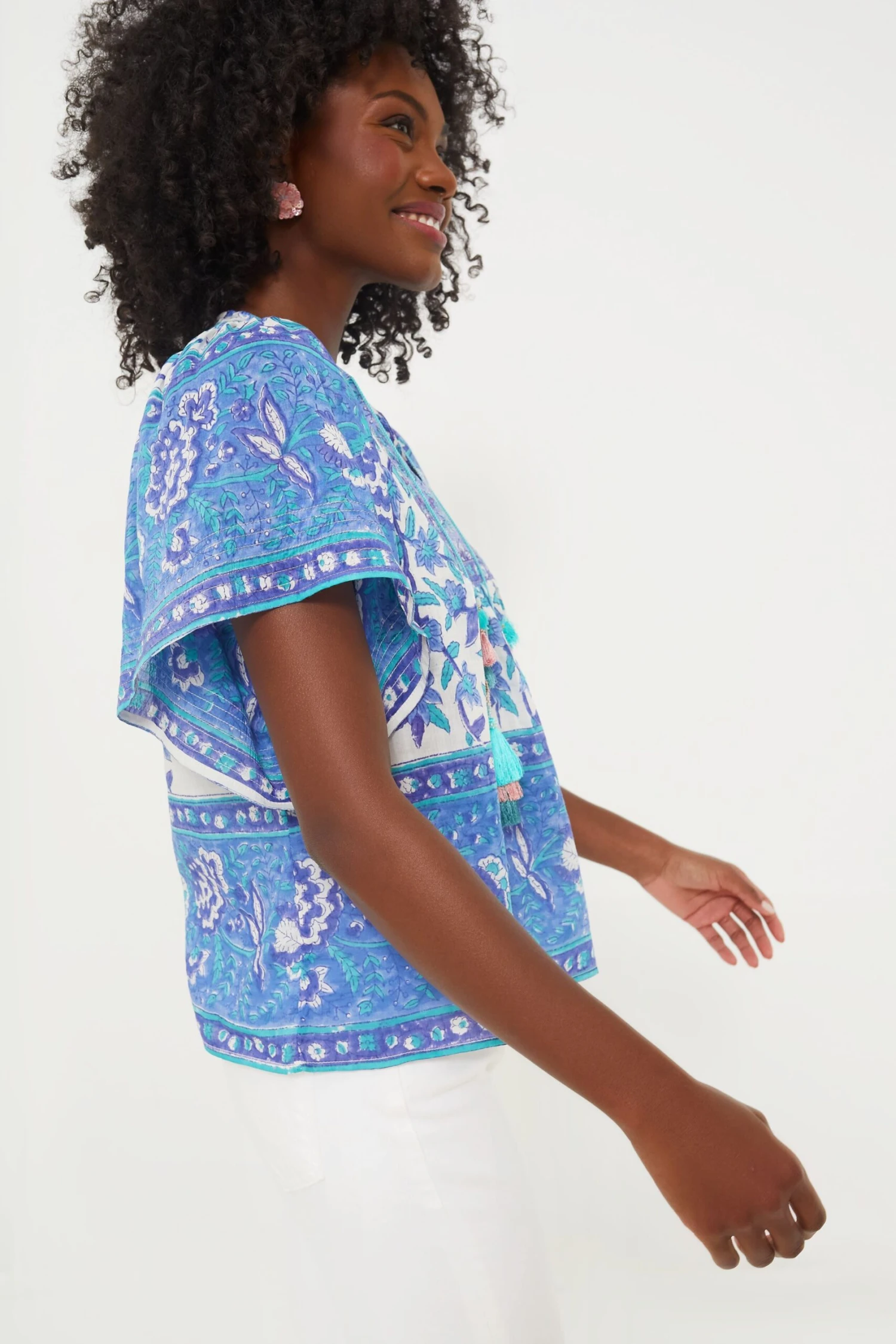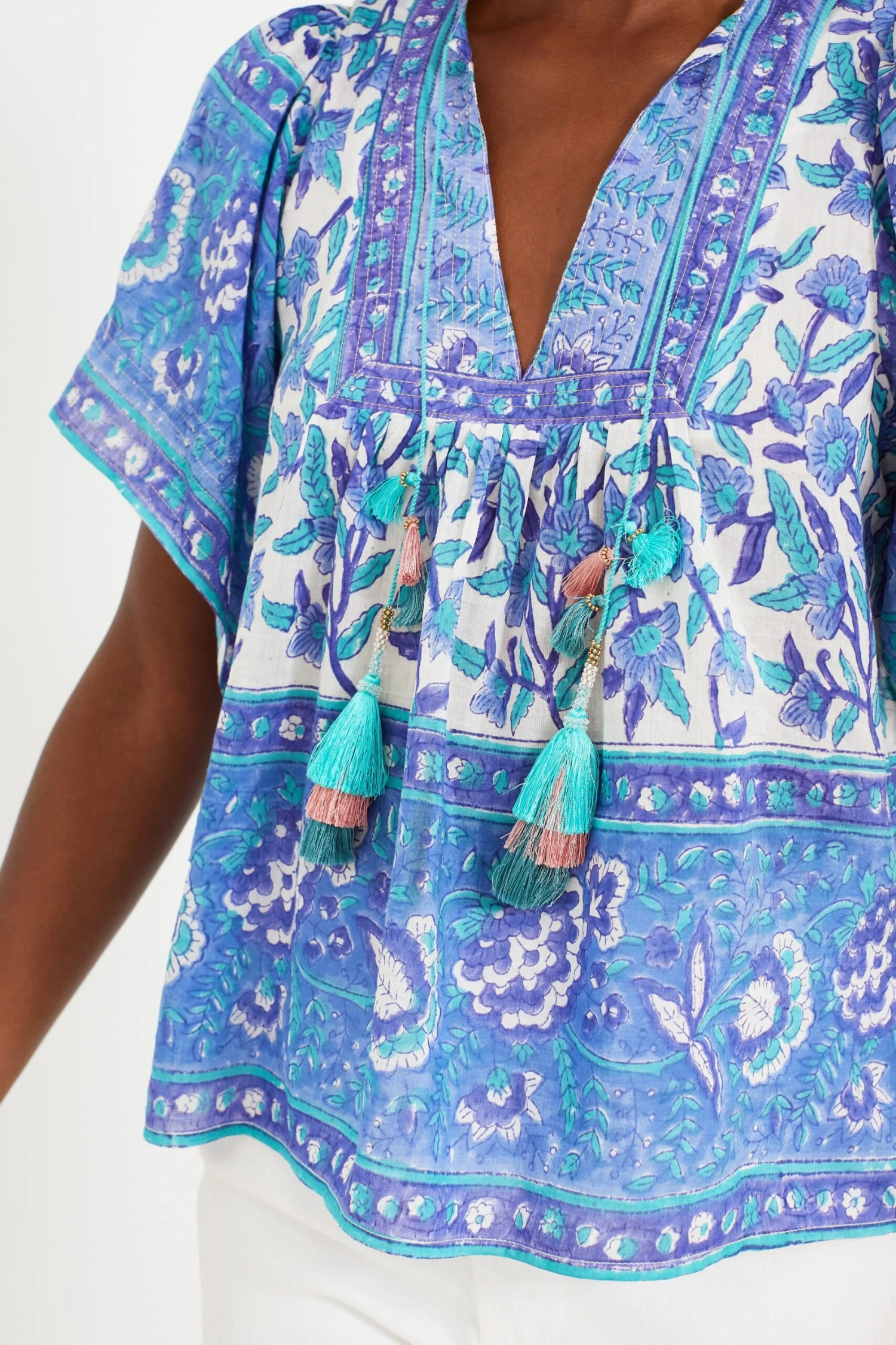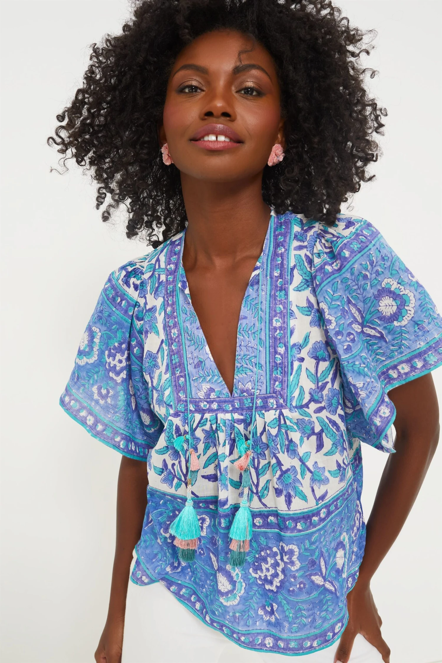 The Angel Top is unapologetically sweet and summery. This cotton blend number features charming flutter sleeves, decorated tassel neckties that can be tied or left undone for playful movement, and to top it off; a hand block-printed design that combines shades of blue, turquoise, and purple for a unique and feminine finish. Park picnics, backyard BBQs, and beach getaways are all just around the corner, add white denim and sandals for endless adventures this season.