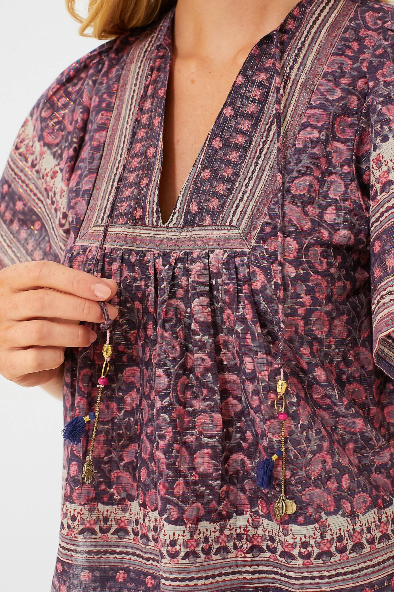 - Beaded tassel ties at neckline