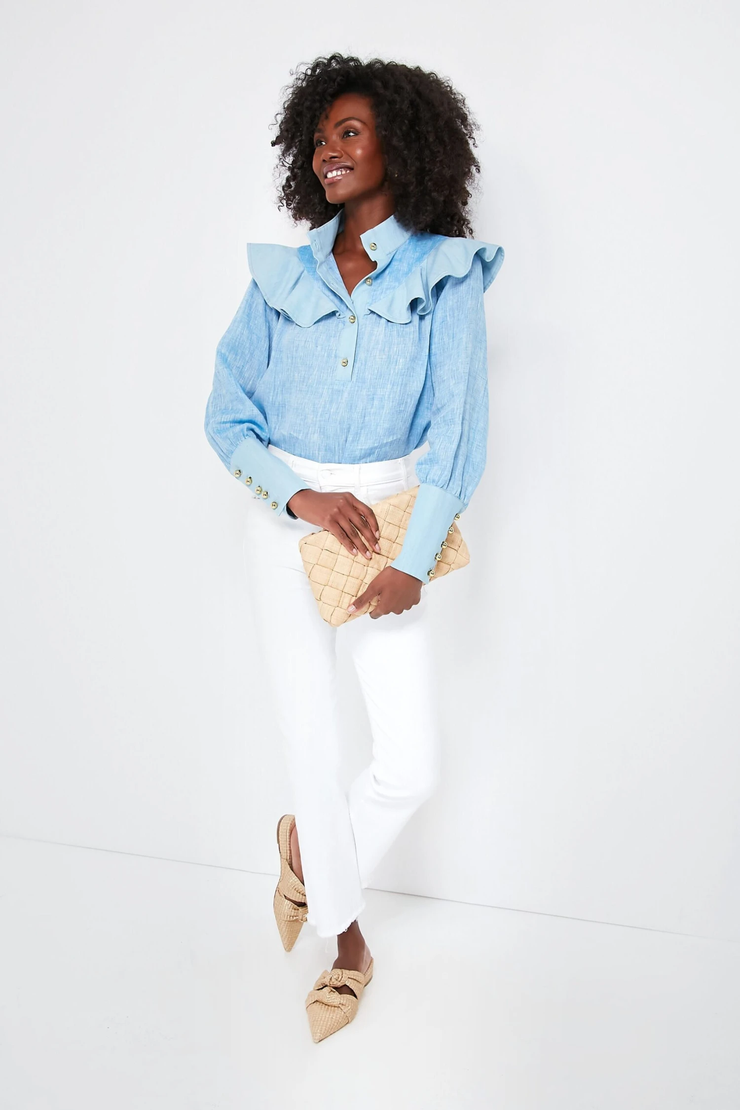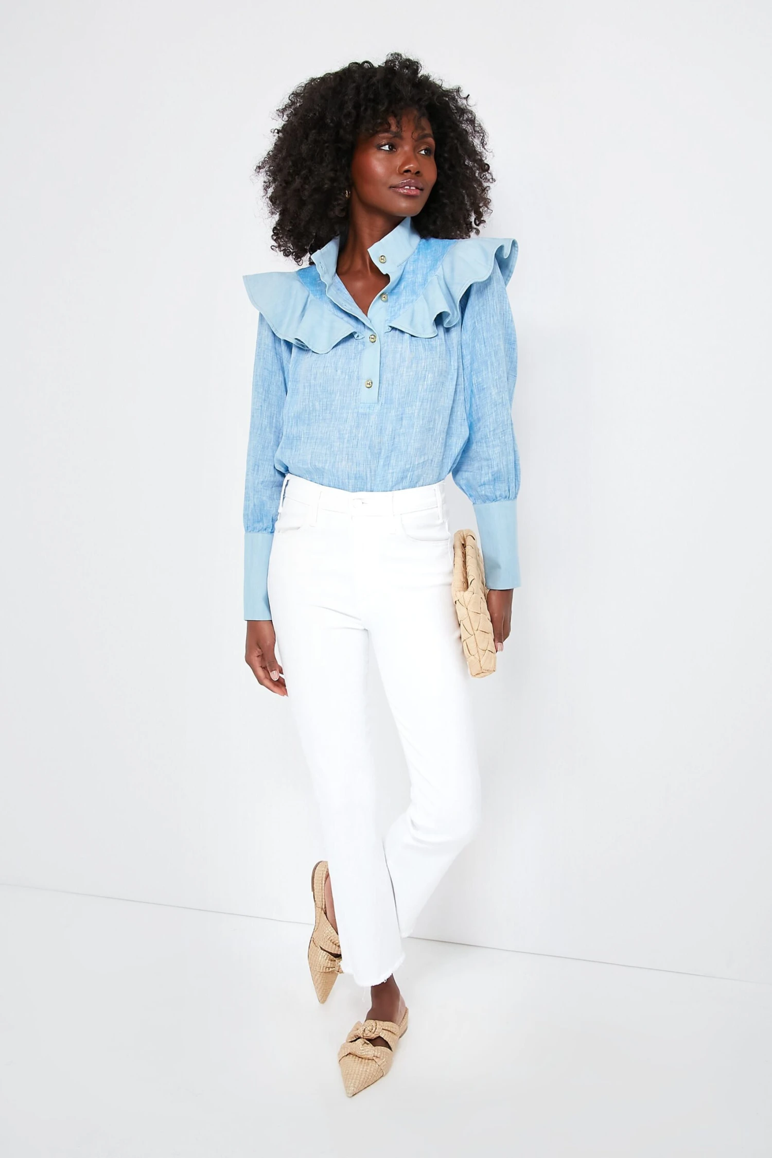 An update to the closet staple solid button down, the Chambray Linen Mirabella Blouse is the seasonless style you will have for years to come. Easily paired with light or dark denim, skirts or shorts, tucked in or out, this top perfectly combines feminine and function without limiting your styling options. The gold buttons and ruffle details have us swooning for this full of personality top!