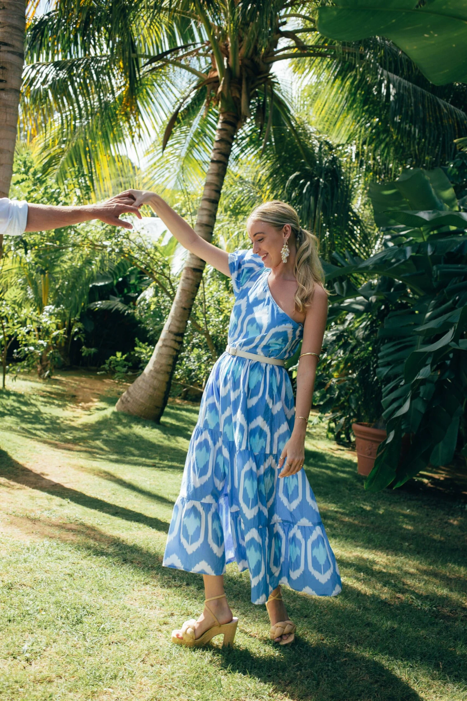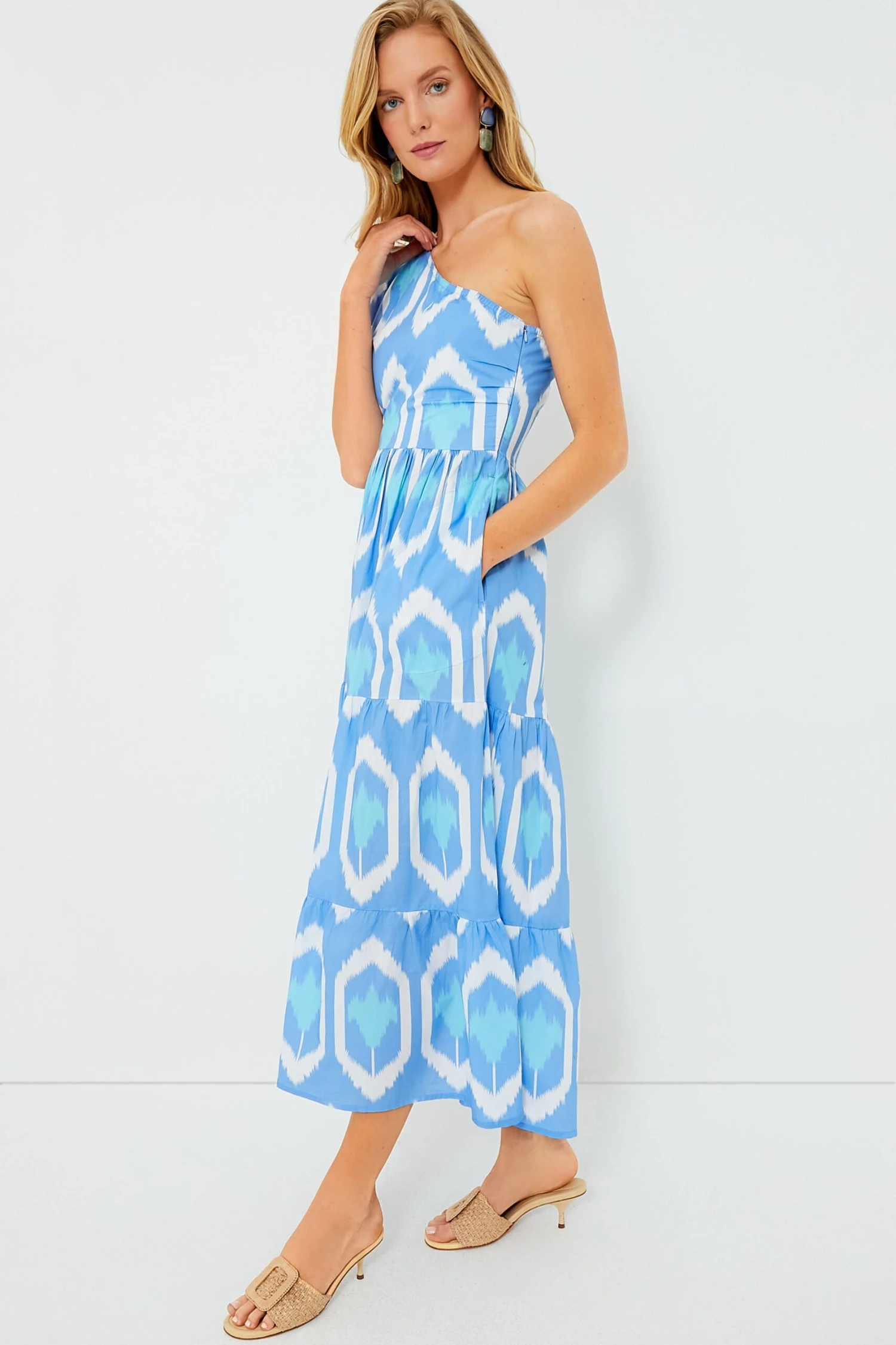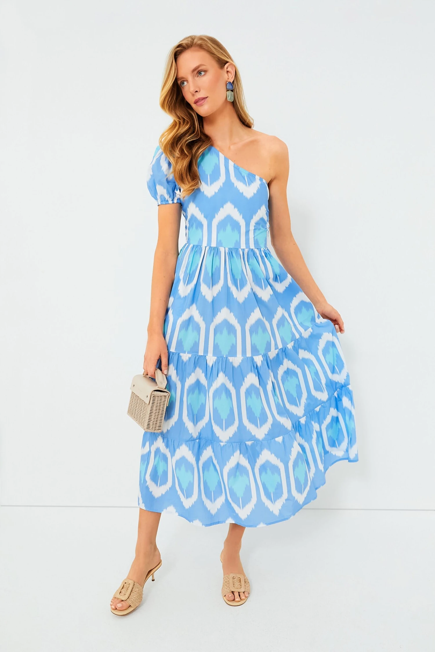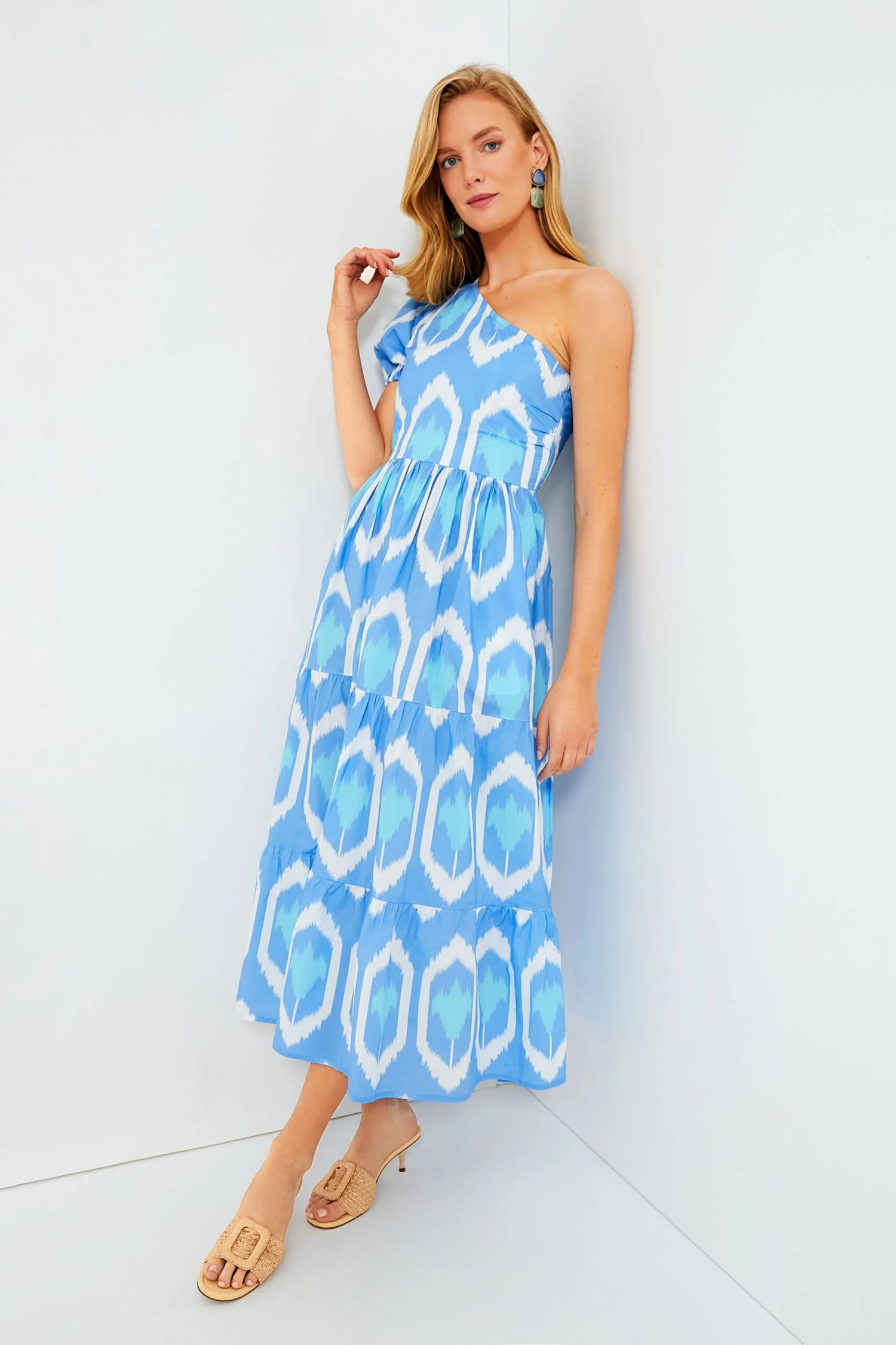 The vacation look of our dreams, the Blue Odisha Dress features a stunning ikat inspired print that has us in the mood for a daiquiri. With an asymmetrical neckline and a single puffed sleeve, this dramatic silhouette makes a real statement — and its lightly structured cotton poplin fabric ensures it is both breezy and packable. Style with espadrilles and a clutch for a romantic evening on your next tropical getaway, or go for a big look and wear it for daytime with sandals and gold jewelry.