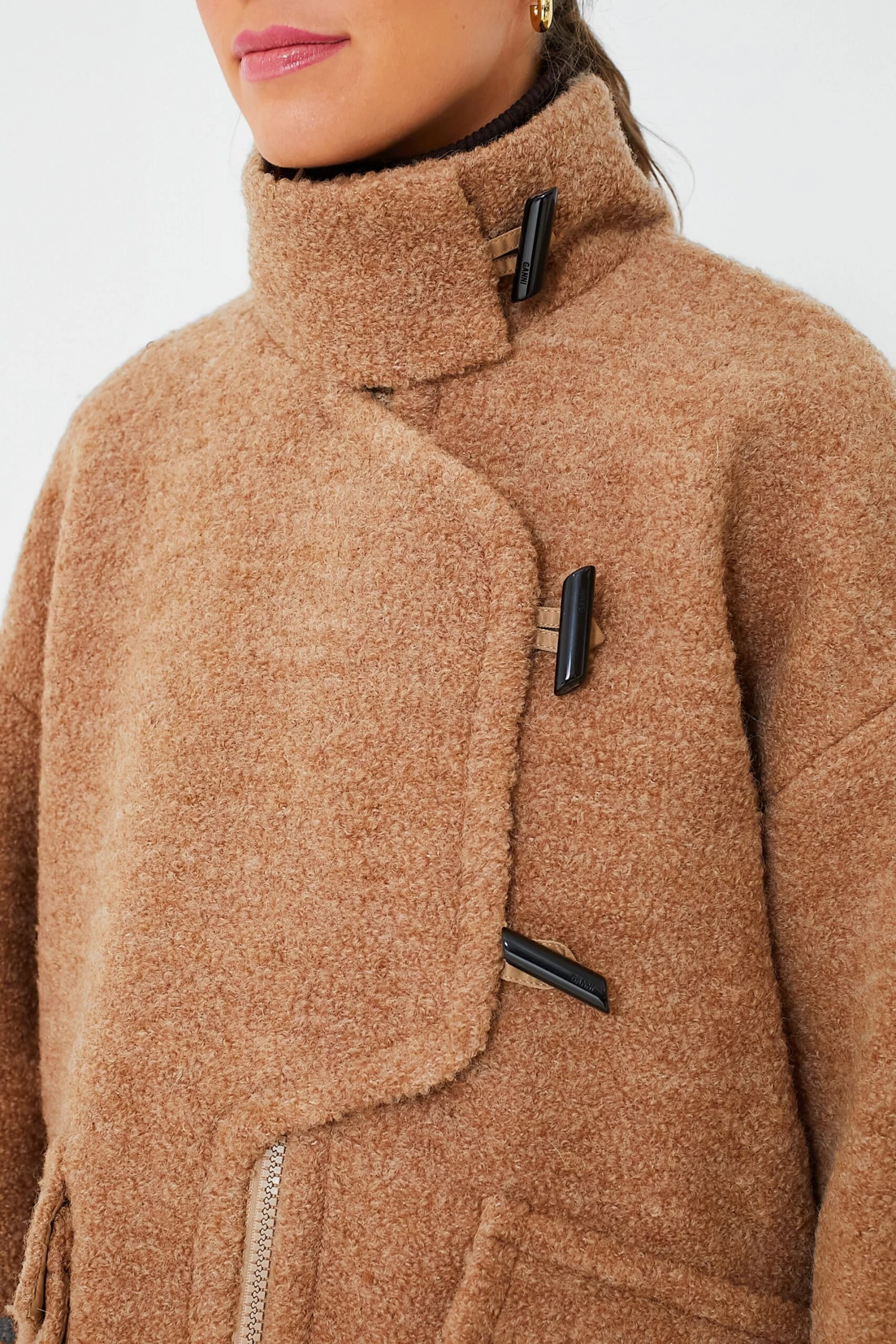 - Front zip with toggle closure