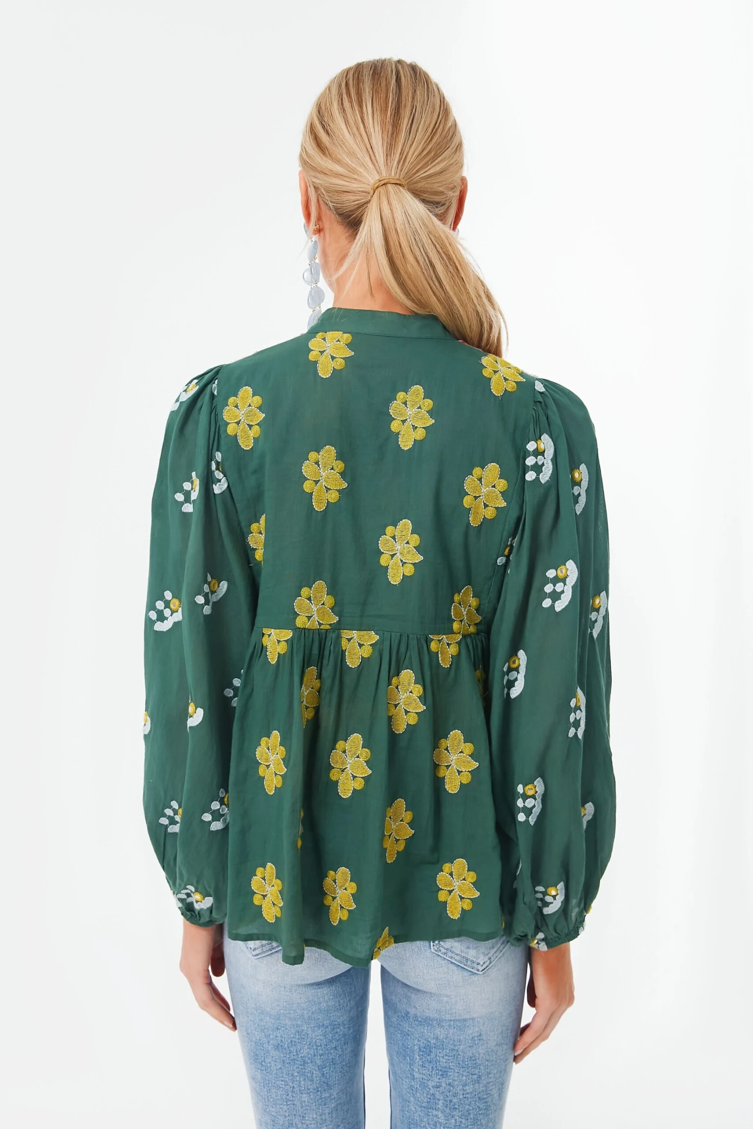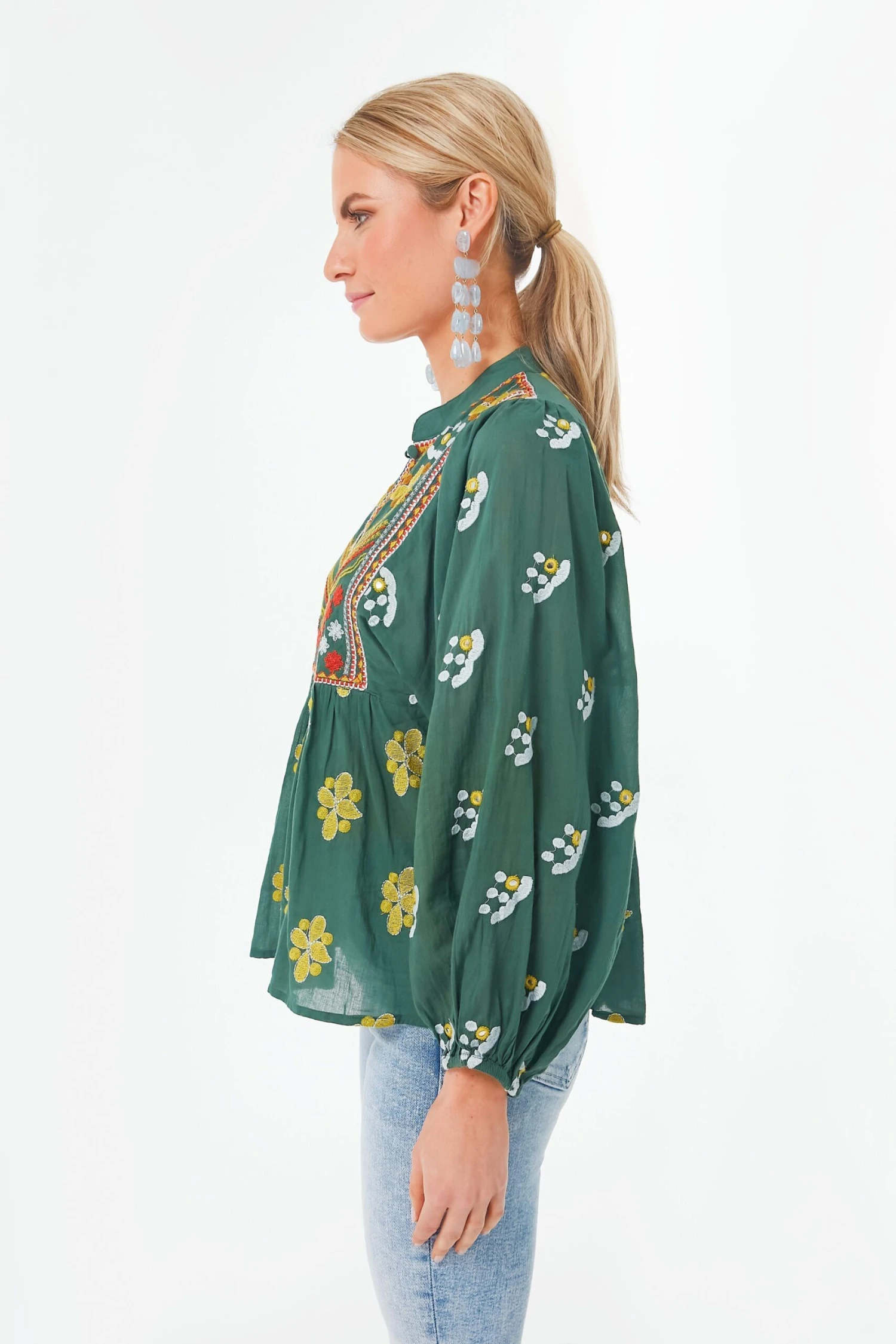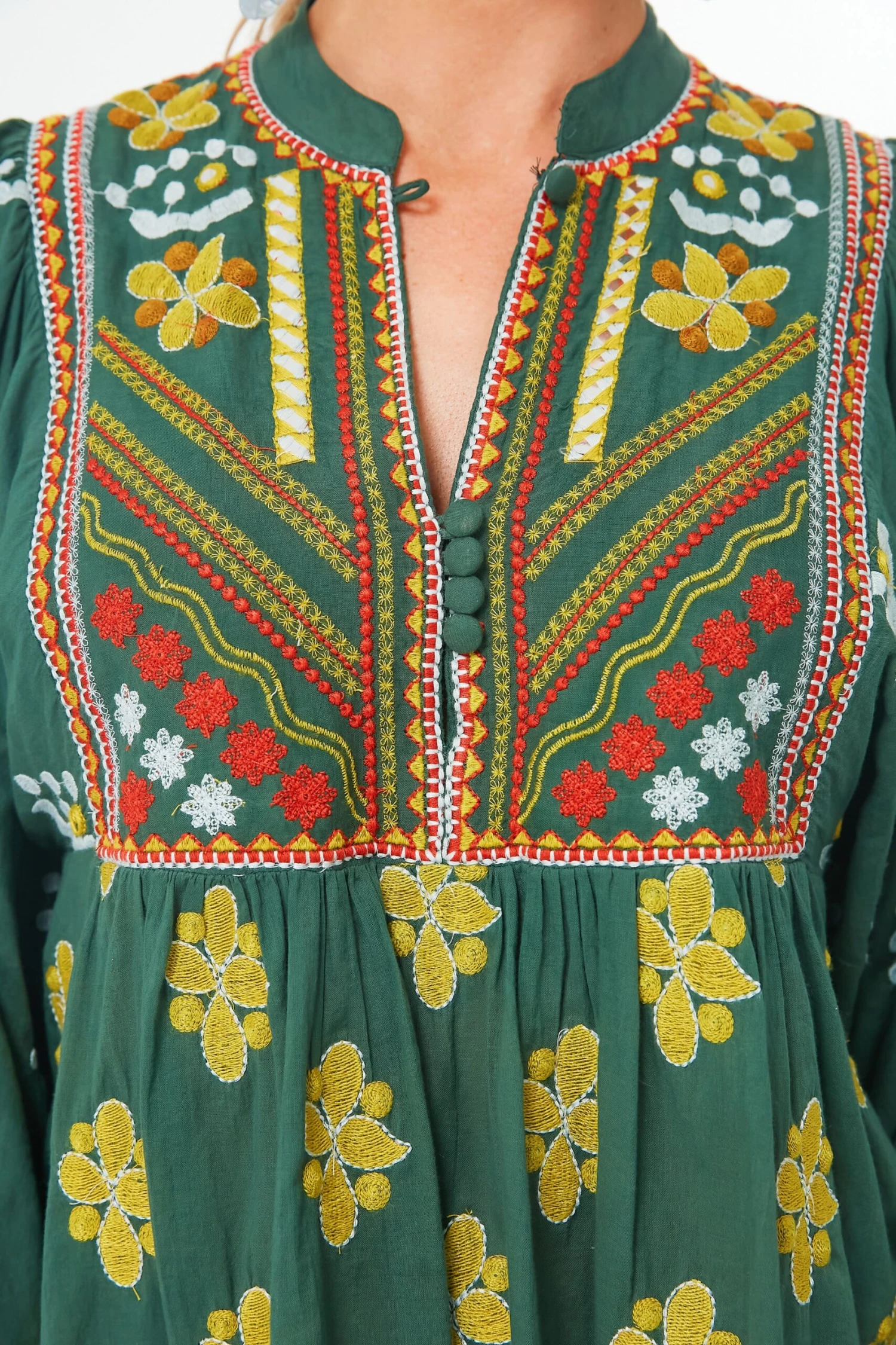 Craving vibrant color, texture, and pattern in your closet? The Green Lucknow Mandarin Top has all of the charming, bohemian-inspired details that bring excitement to your everyday ensembles. Cut from a structured cotton poplin and adorned with multicolor embellishments, this one of a kind blouse features long balloon sleeves, covered buttons, and an embroidered yoke. Perfect for pairing with your favorite denim for anything from picnics in the park to the school pickup line, this style is sure to be worn on repeat.