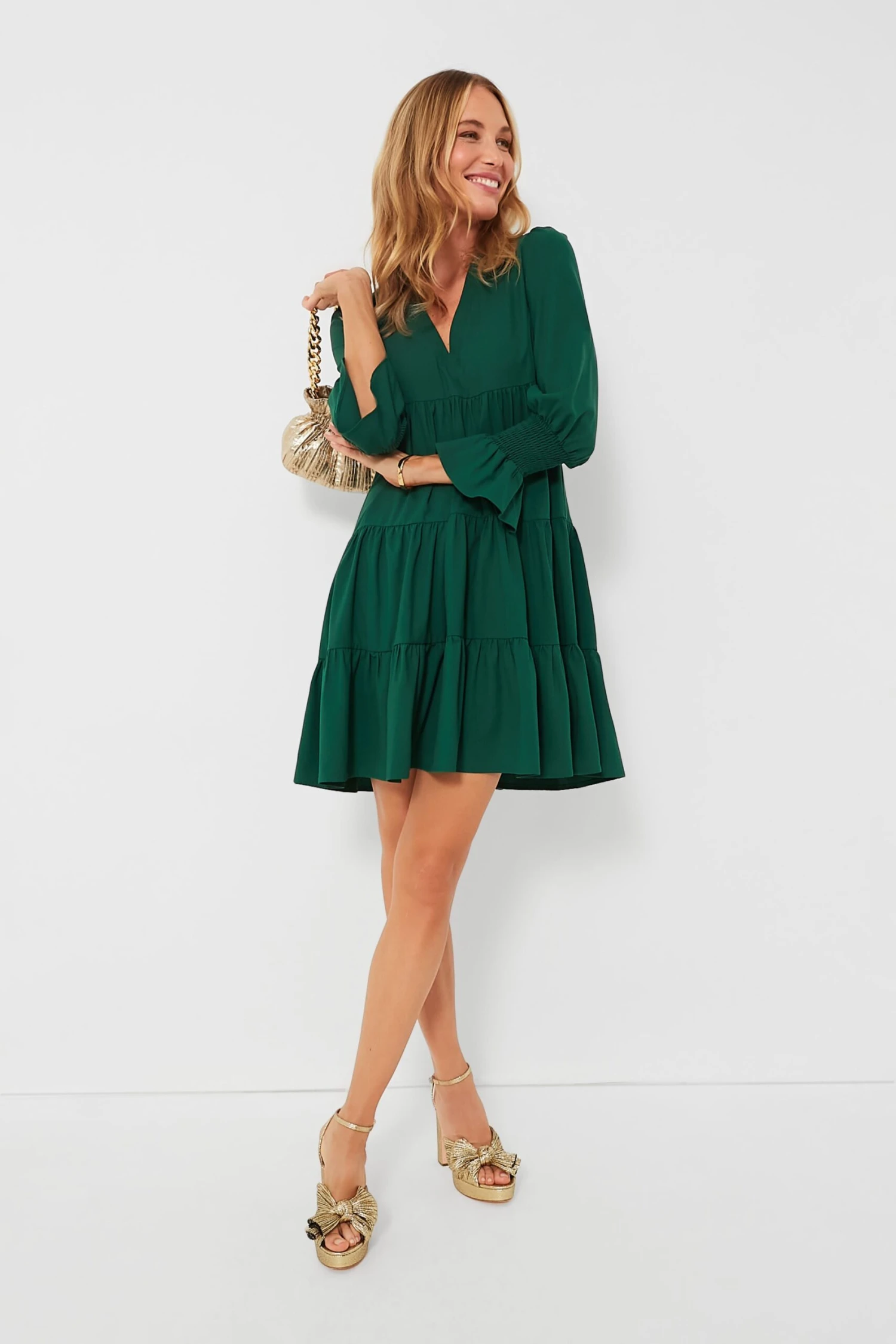 Meet one of our favorite silhouettes, the Crepe Kenzo Dress. Featuring feminine flutter smocked cuffs, a V-neckline, and a loose empire waist, this is the most flattering flirty frock! Pair this hunter green stunner with flats for a casual look or dress up with heels and statement earrings for date night.