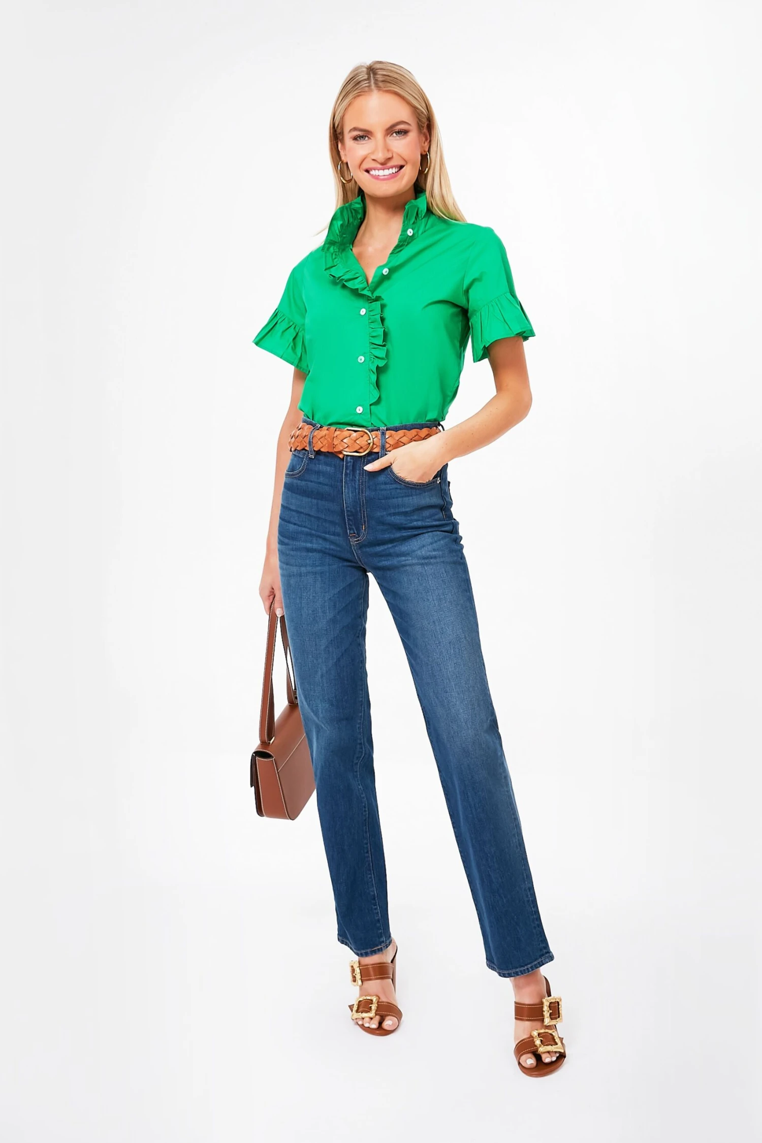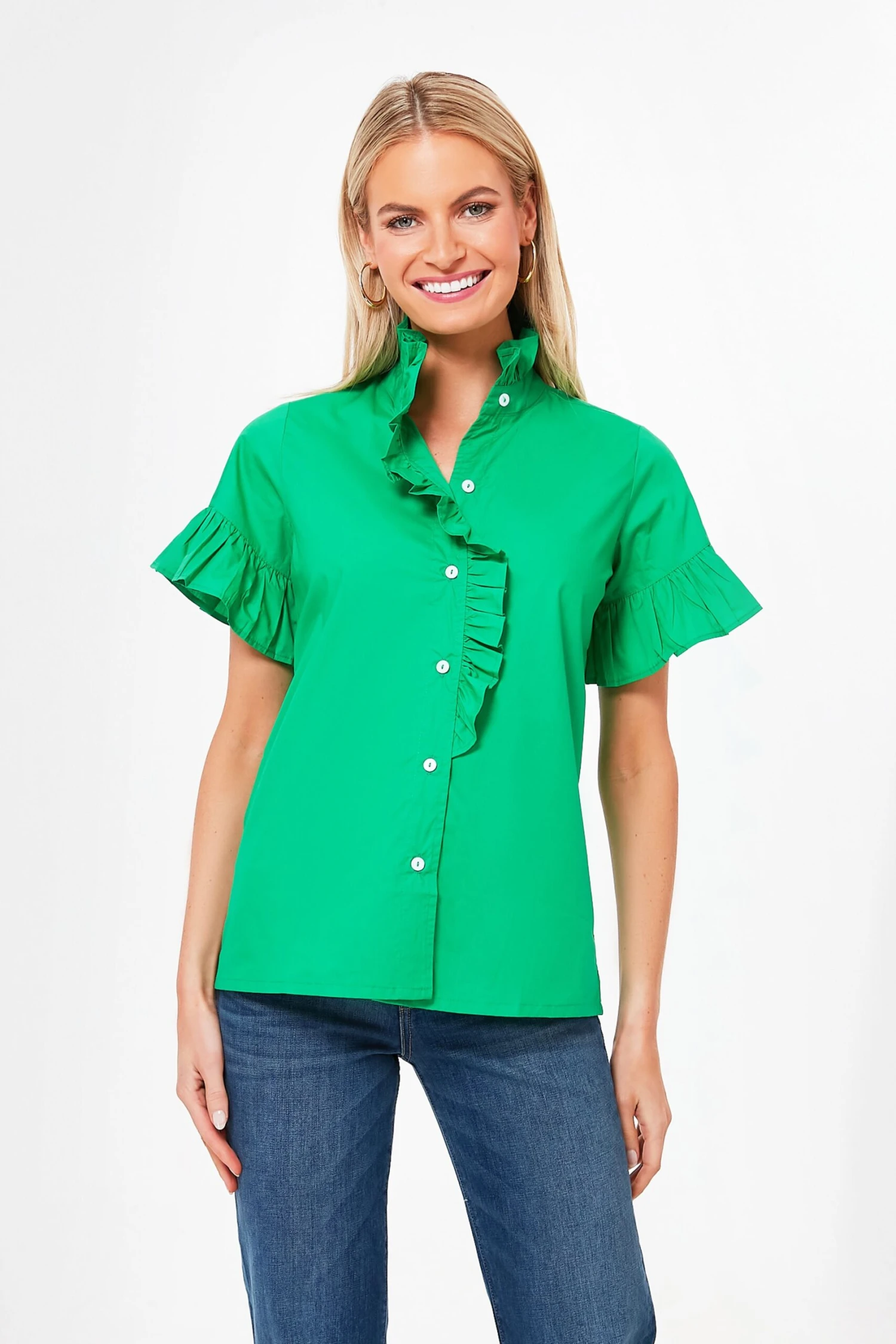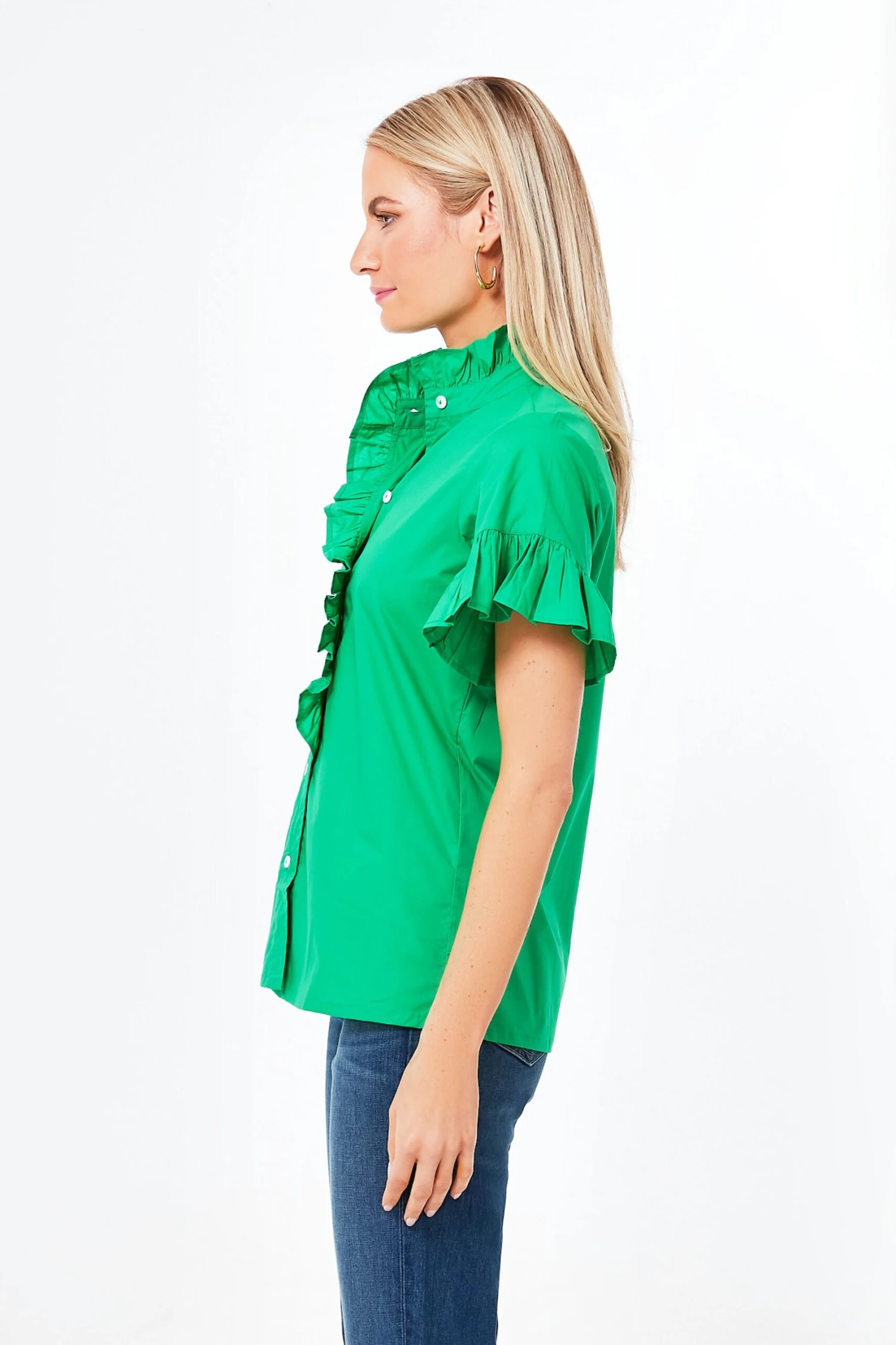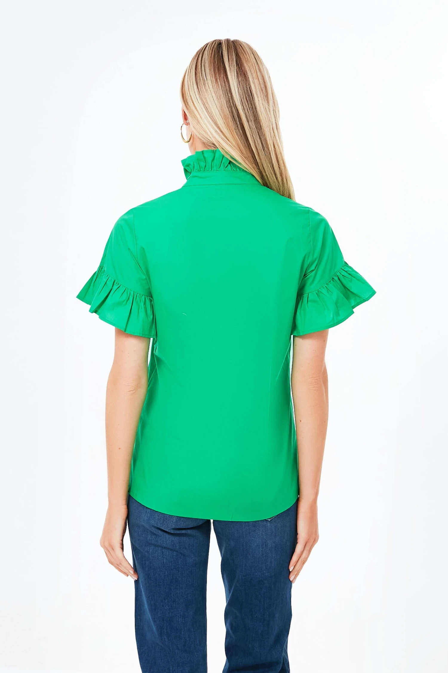 A crisp cotton blouse with endless charm, the Kelly Vanessa Top elevates a classic by adding a bright and cheery hue. With a stand collar that frames the face, flattering bell shaped sleeves, and rippling ruffles embellishing the placket, we’ve never loved a button down more. Perfect for the everyday when paired with denim and flats, great for brightening up the office with trousers and loafers, or light enough to pack in a getaway bag, this silhouette can do it all.