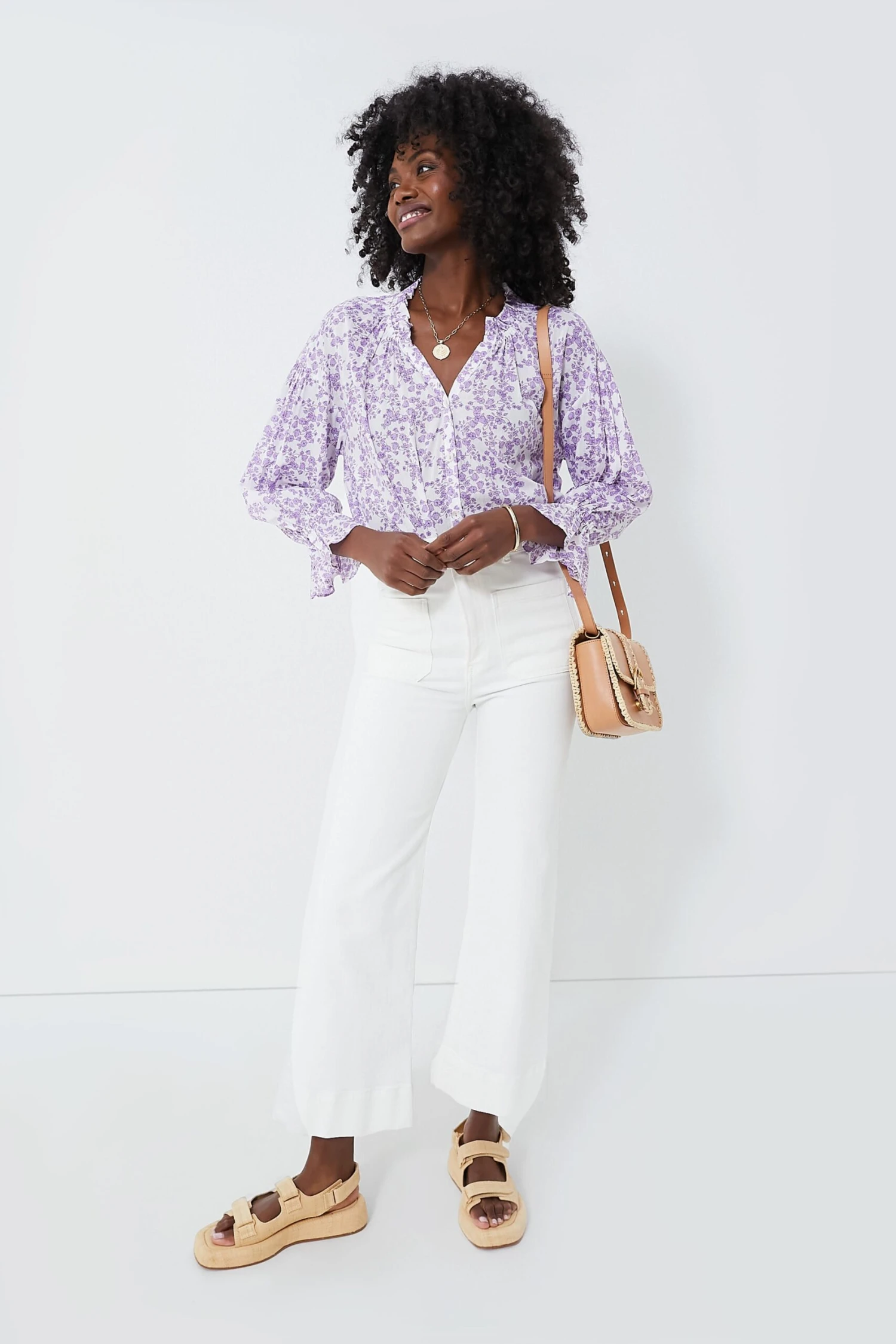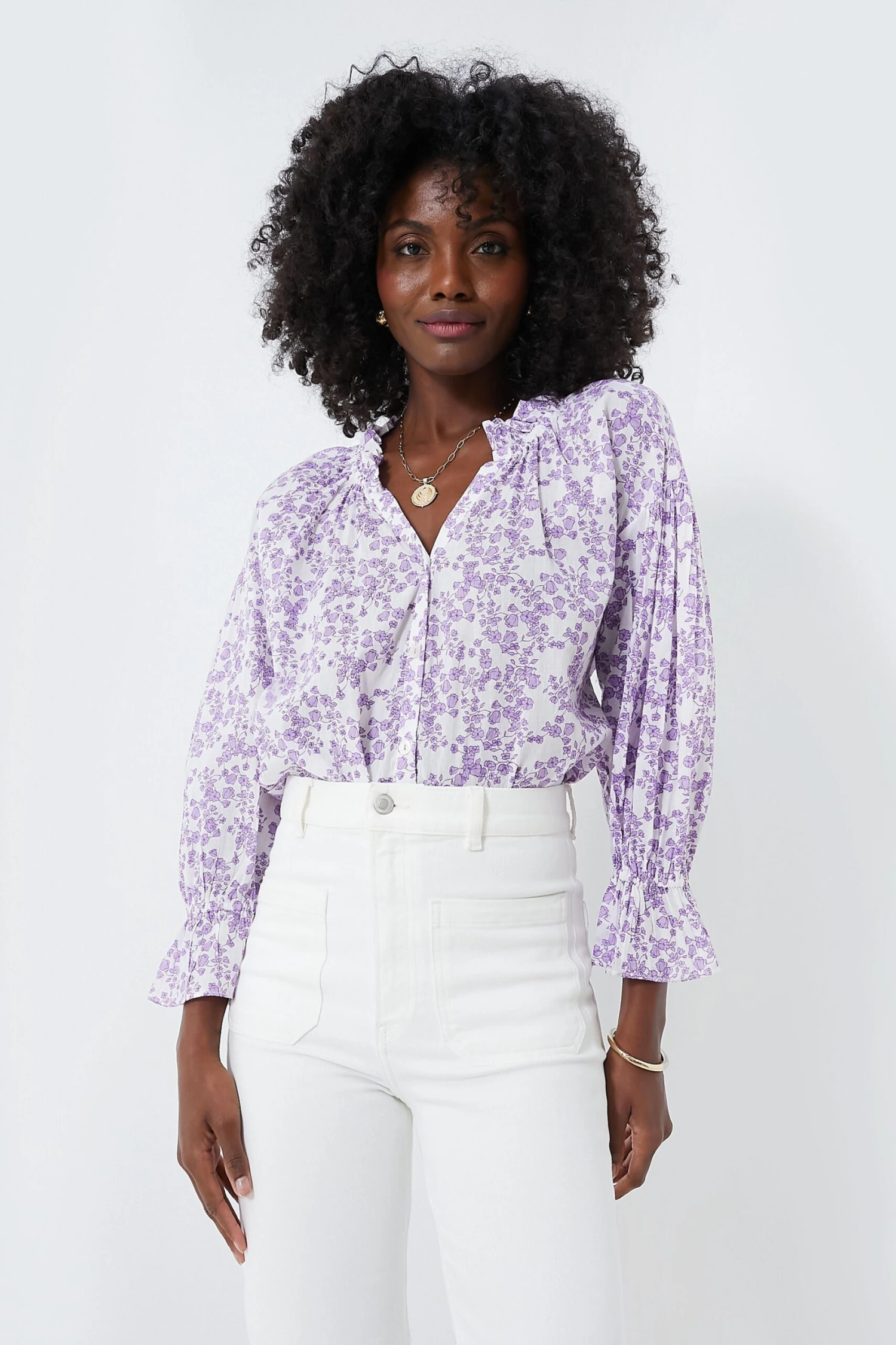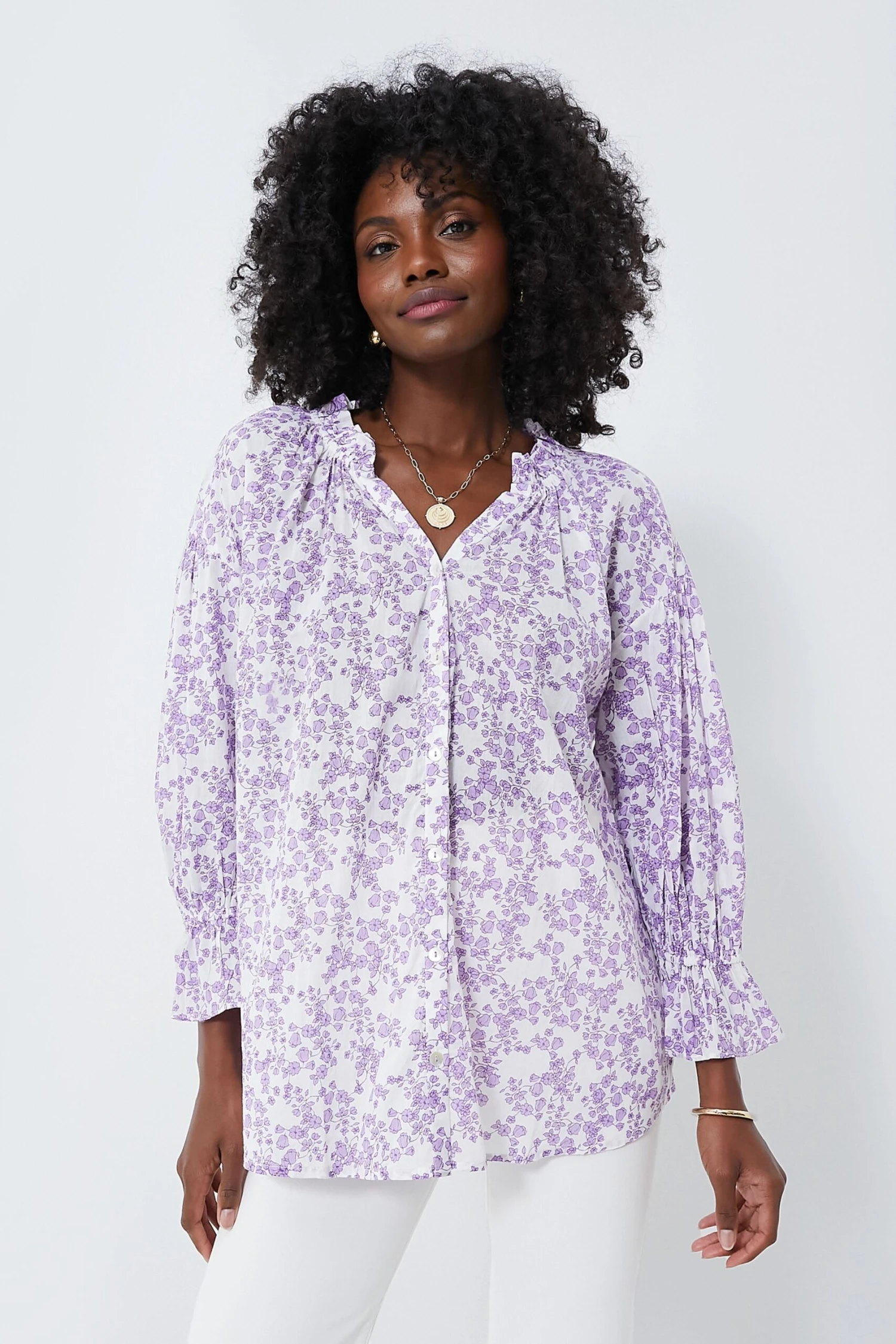 In that perfect pale purple and white color palette we all love for this time of year, the Lilac Lucrecia Rachel Shirt is effortless and exudes relaxed femininity. A ruffled collar and cuffs provide a hint of maximalism that complements the simple button down placket and rounded hem and makes this top feel extra special. Pair with any shade of denim, as well as sandals or sneakers — this summer style staple looks good with anything.