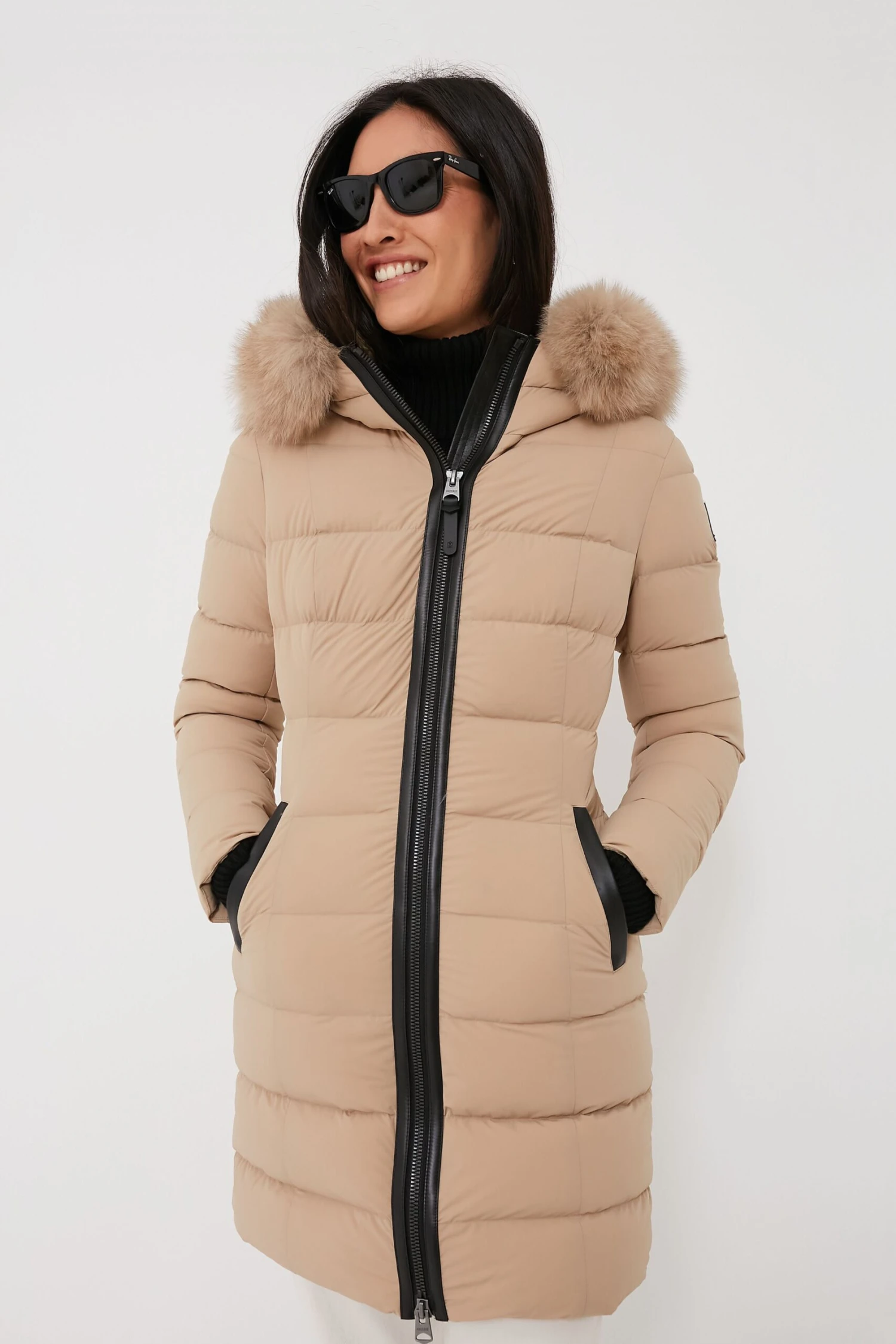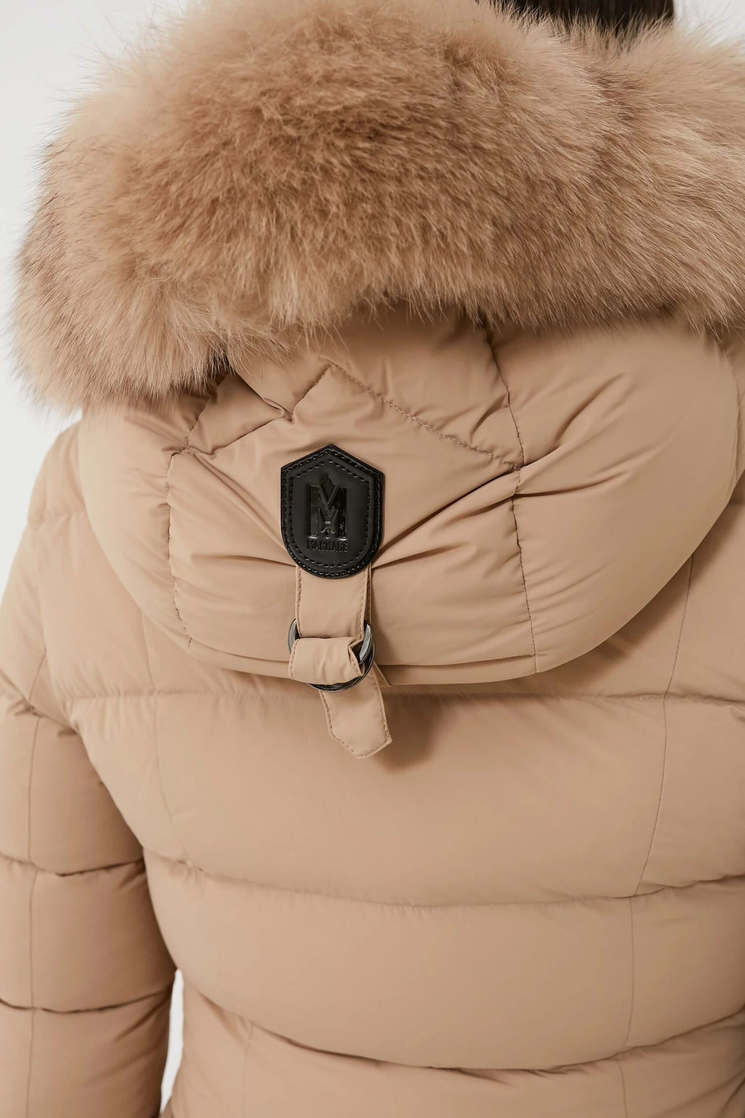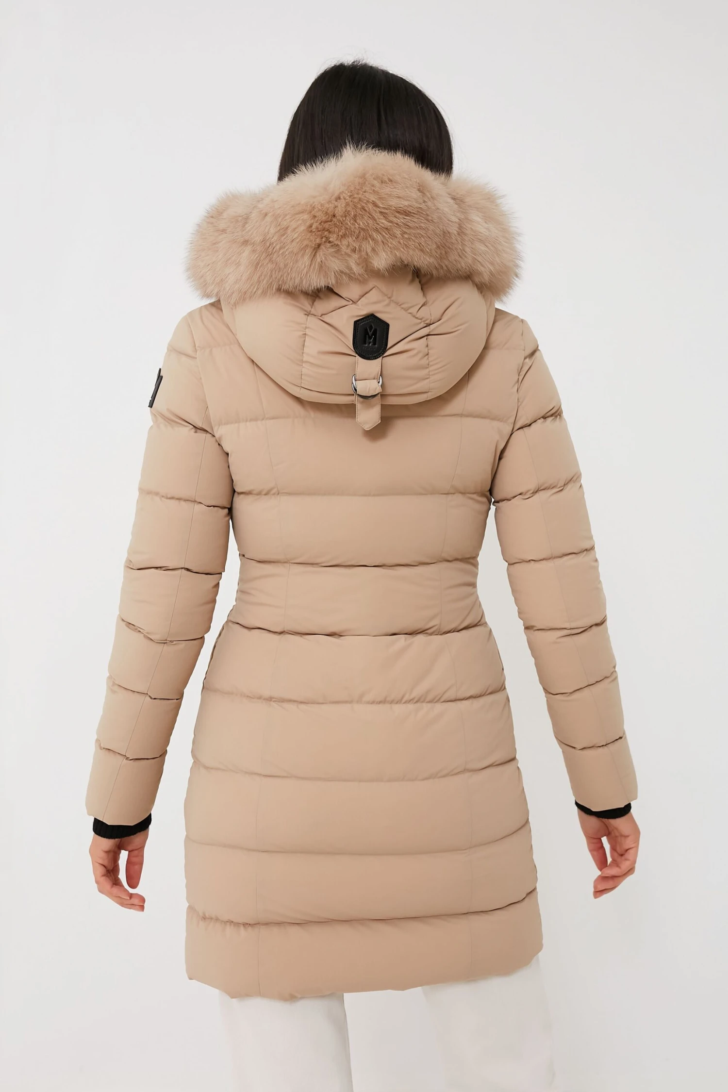 The Light Camel Calla Coat is a longline down-filled parka in a flattering, fitted silhouette. Made to keep you warm without sacrificing style, it features an attached hood with a removable fur trim, leather trimmed pockets, and an on-trend puffy quilted exterior that will have you feeling cozy all day long. Wear this sleek yet functional outerwear over a turtleneck when snow is falling, then add boots and a beanie for that aprés ski look.