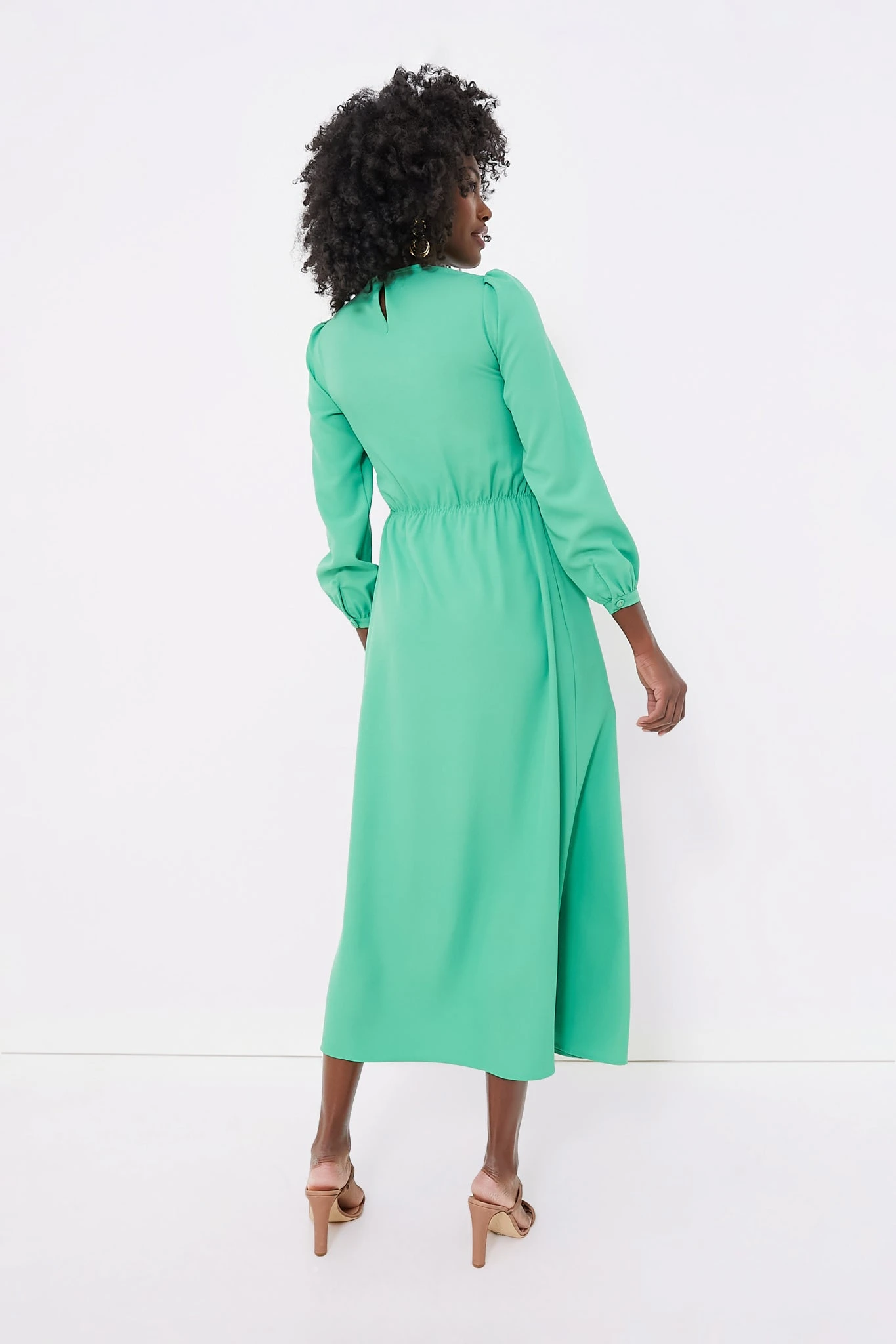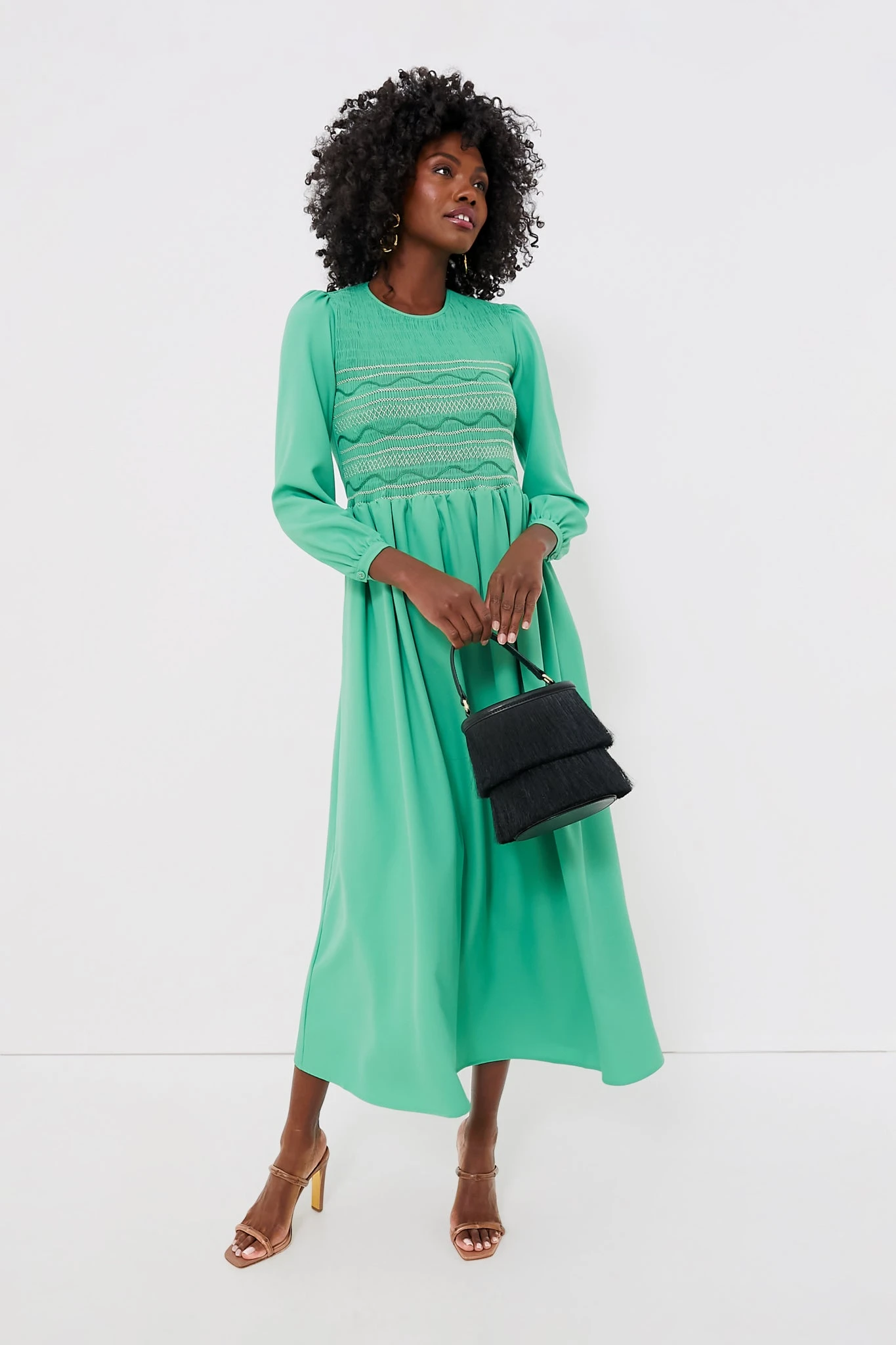 The Mint Crepe Lea Dress is handcrafted by skilled artisans in Tuscany and the details are plentiful for this maxi. Featuring a round collar, bracelet length sleeves, and a smocked bodice with contrast stitching, this cheery number is as flattering as it is comfortable and chic. Add heels and statement earrings for a punchy party look or sandals and raffia accessories for your next vacation.