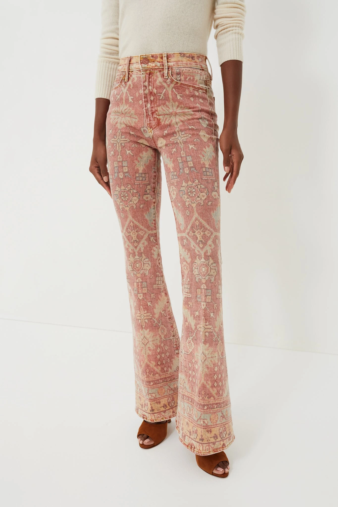 The Rug Burn The Super Cruiser by MOTHER are the statement pants we have all been searching for. With a flattering high rise and flare silhouette, these jeans are complete with a faded Moroccan rug print in soft shades of salmon, yellow, and mint green. Pair with a plain sweater and boots for an eye-catching all-day look.