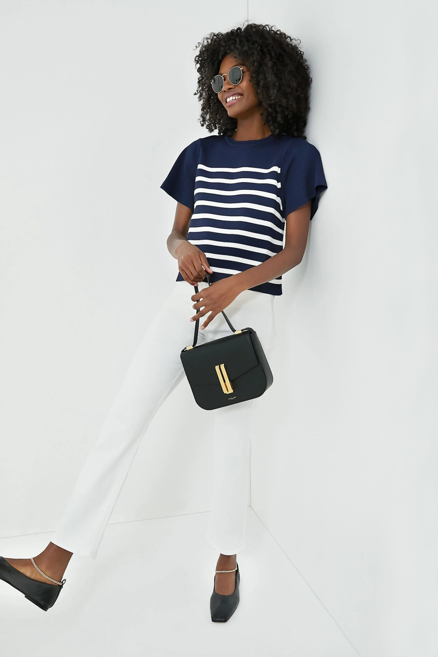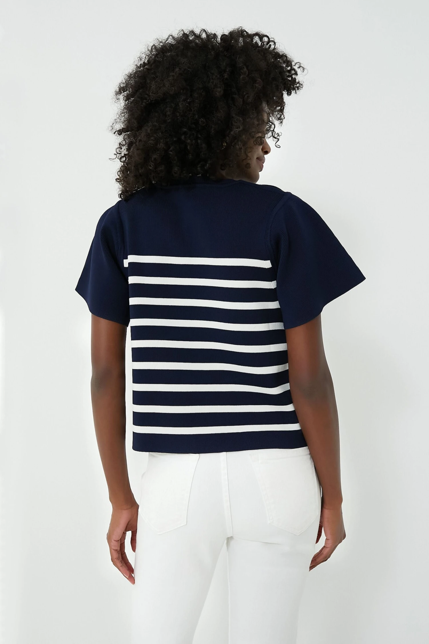 The Navy and White Kirby Top is your new elevated yet effortless polished tee. Cut from a stretchy knit that adds a refined finish, this striped number features structured sleeves that will stay crisp and hold their shape along with a cropped length that works perfectly with high waisted bottoms. From cutoffs to trousers to wide leg denim, this is sure to play on repeat season after season, year after year.