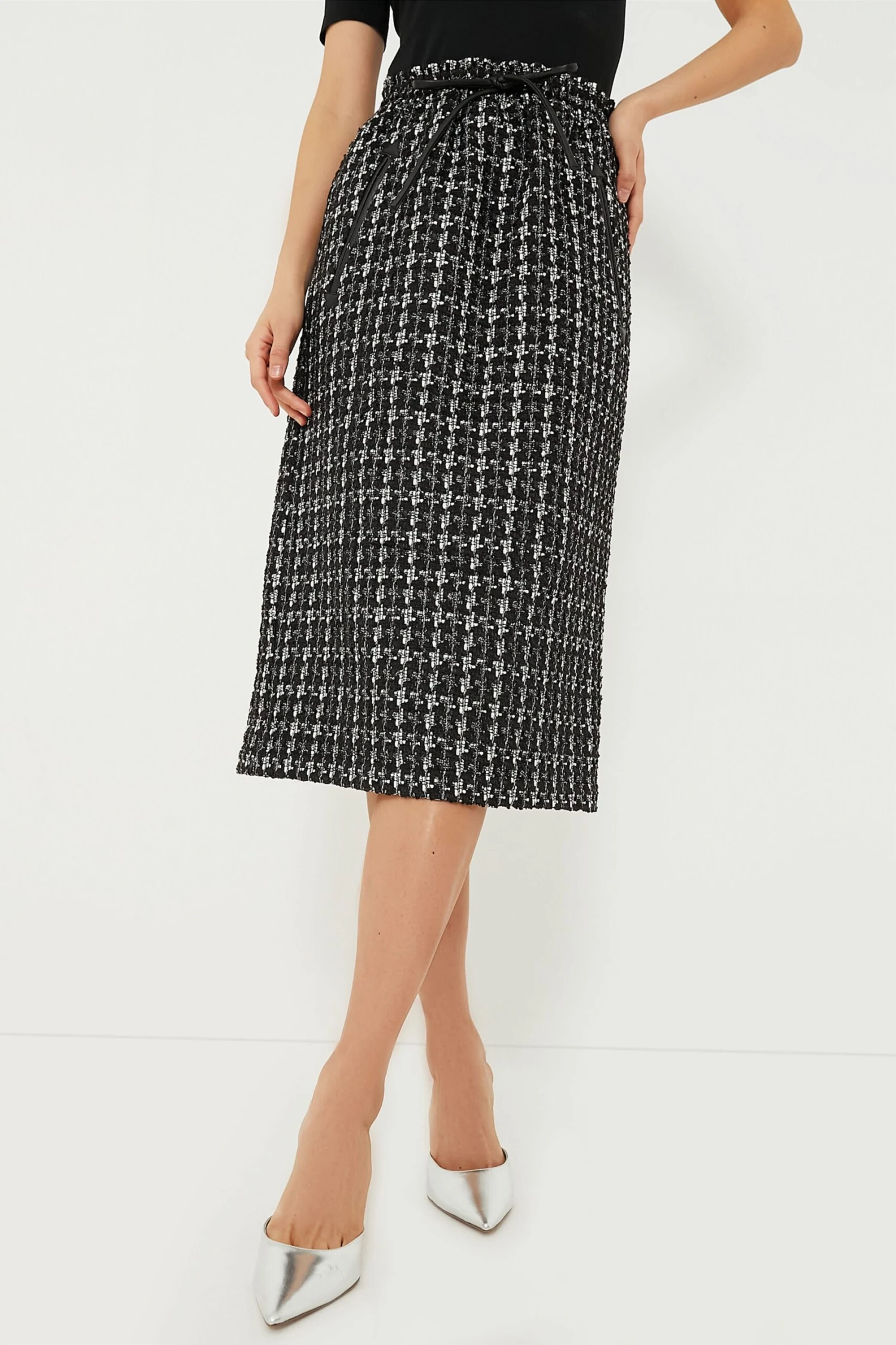 - Faux leather tie at waistband