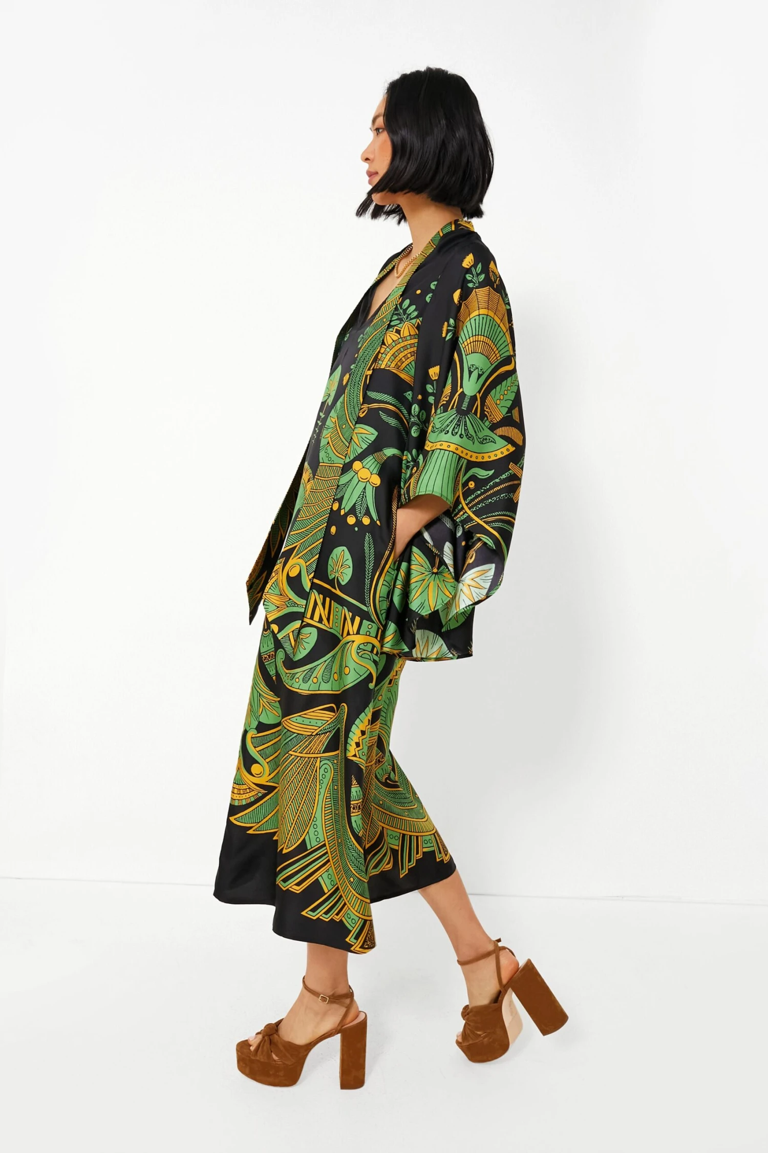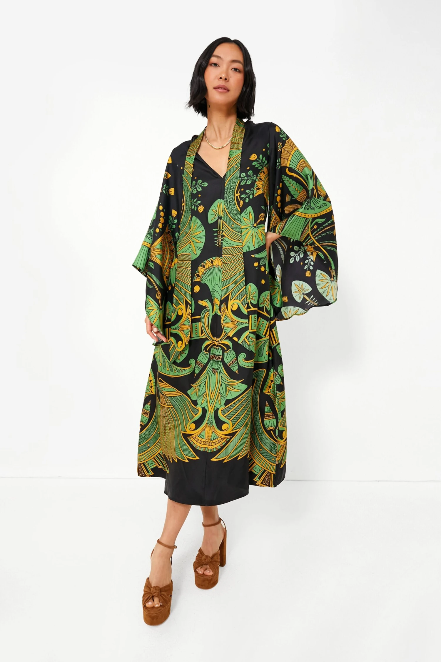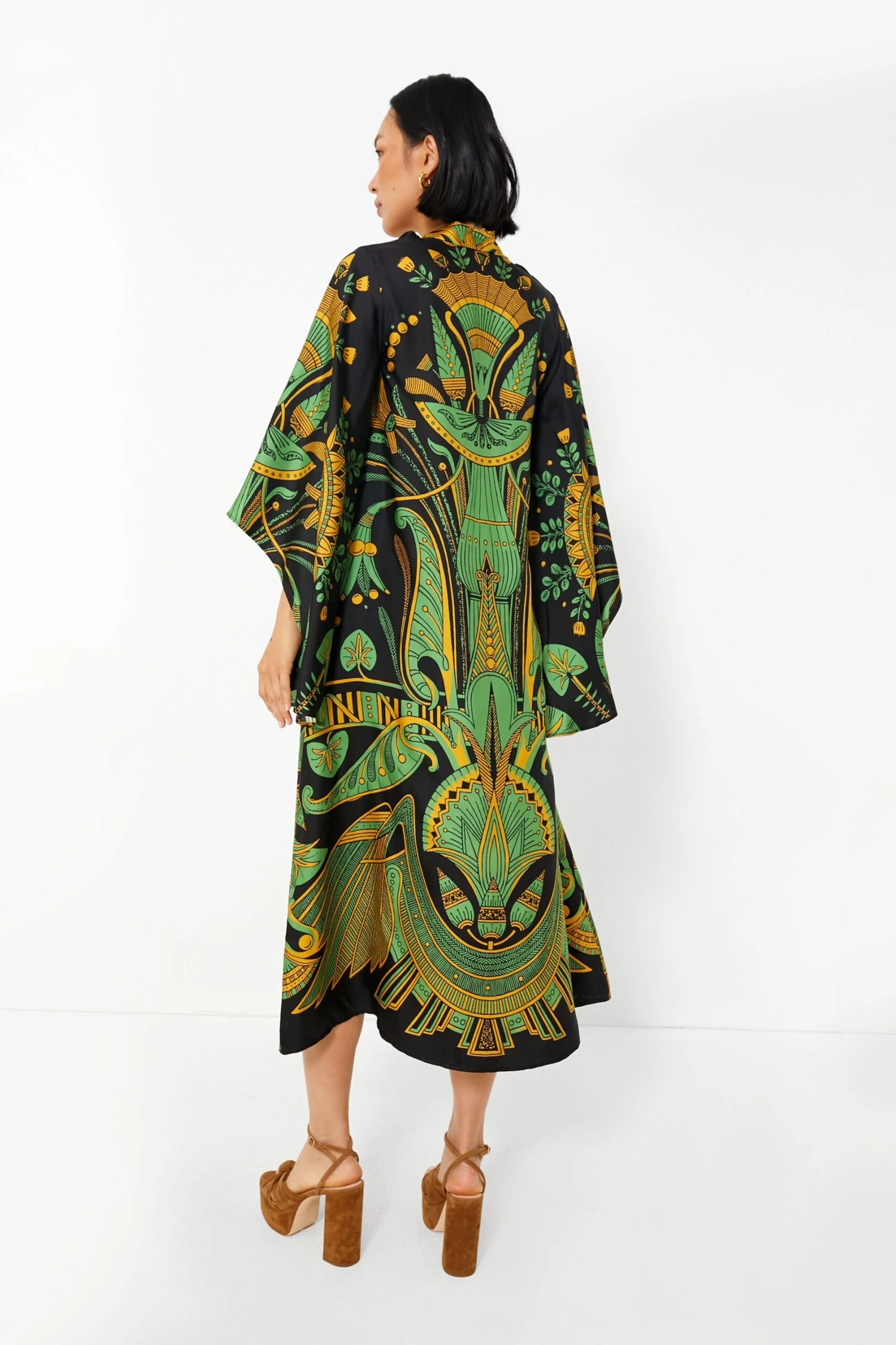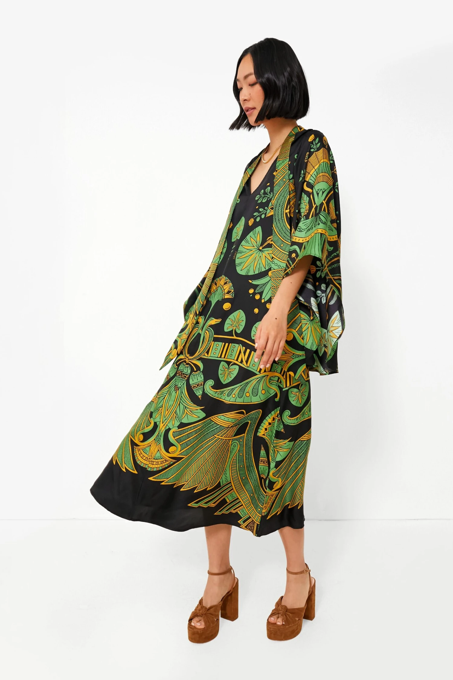 Bringing opulence to your day to night wardrobe, the Nile Magnifico Dress is all kinds of breathtaking. Crafted from luxe silk twill and complete with an Egyptian-inspired tropical yet Art Deco-themed print, this magical midi is ultra-versatile. Wear it with the V-neckline in the front with the ties loose, with the ties done up around the neck like a scarf, or backwards to create a lovely stand collar and low back combo. Just add heels and you’re ready to receive some compliments when you arrive at the function!
