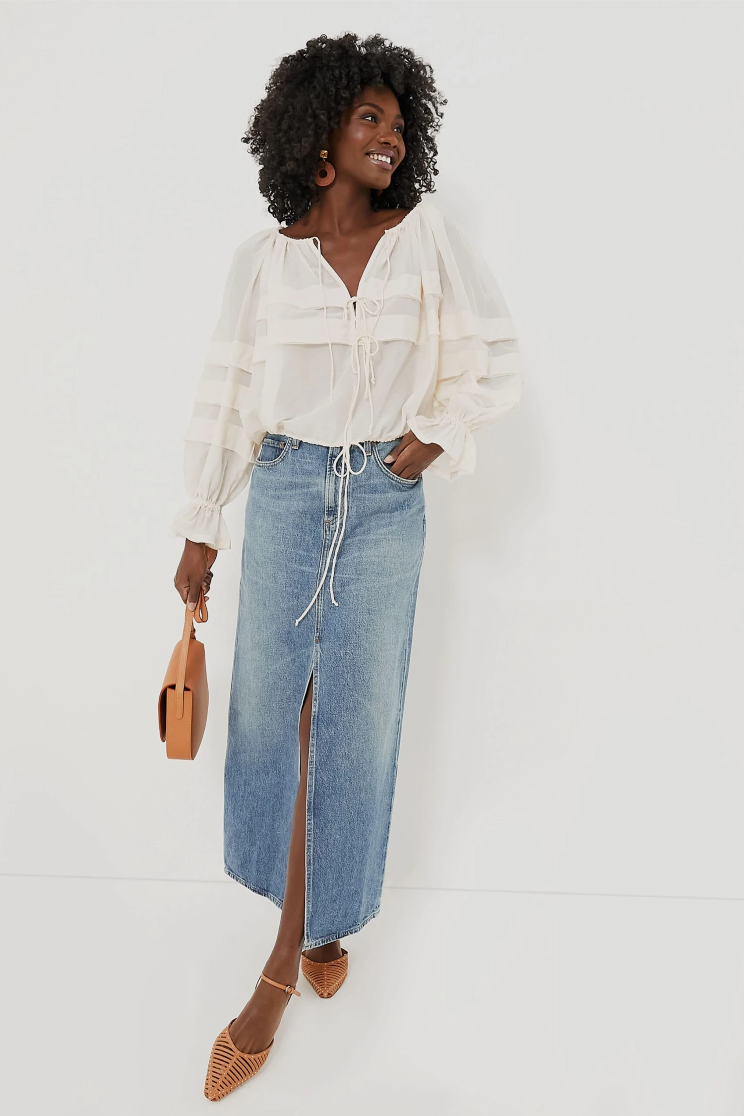 The Renaissance and the 70s come together in a harmonious blend in the Ivory Cora Blouse. Made from soft cotton-silk voile and boasting long voluminous sleeves, ruffle cuffs, and drawstring tie details, this top is feminine and bold. Pair with denim and boots, or with a maxi skirt and heels!