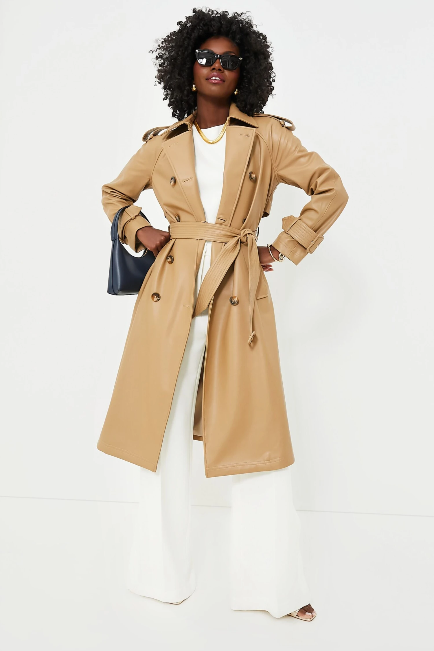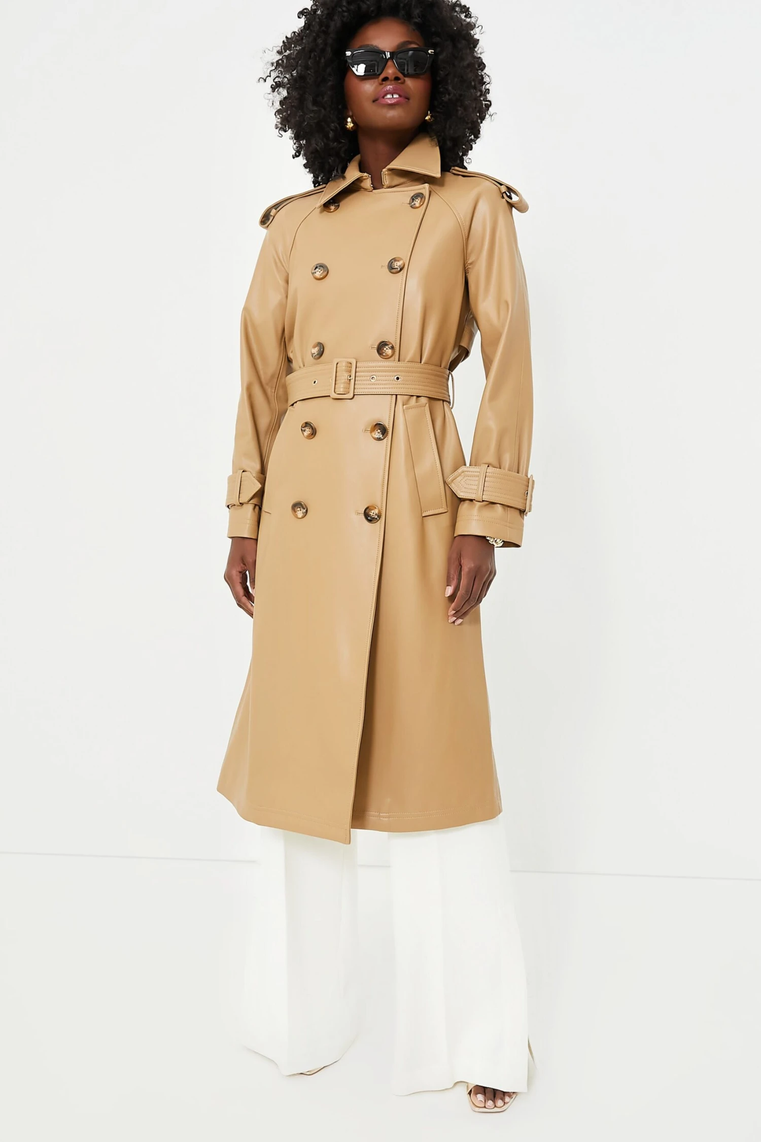 The Khaki Conneley Dickey Trench Coat is a true wardrobe investment youâll wear day after day, year after year. Expertly tailored in a butter-soft vegan leather, it features a fitted double-breasted silhouette, shoulder straps and a waist-defining removable belt. Lean into its cool simplicity and throw it over your favorite jeans-and-a-tee combination or pull on a pair of knee-high boots and add oversized sunglasses and a scarf for a mysterious, dramatic look thatâll make everyone wonder who the it-girl is.