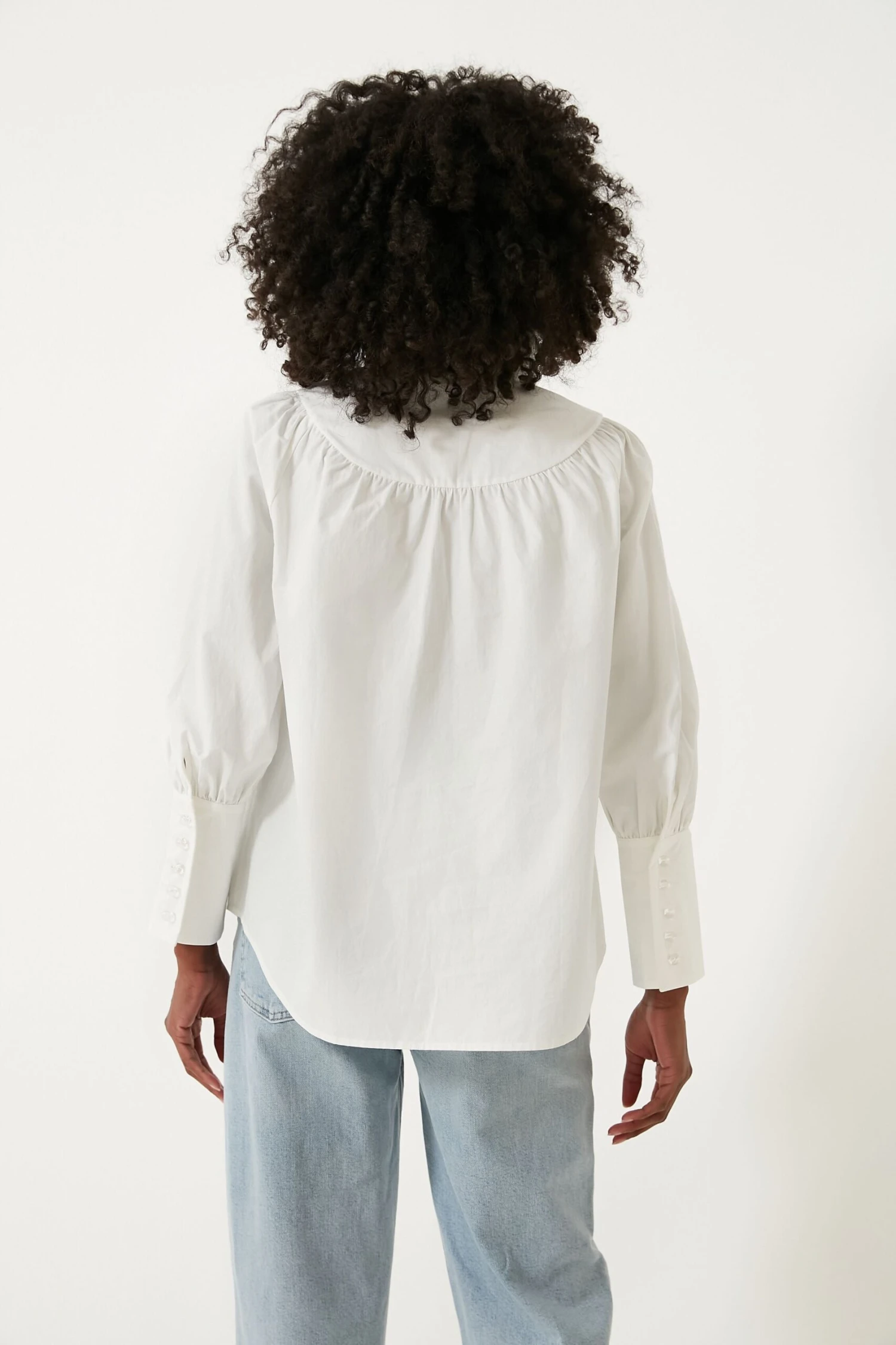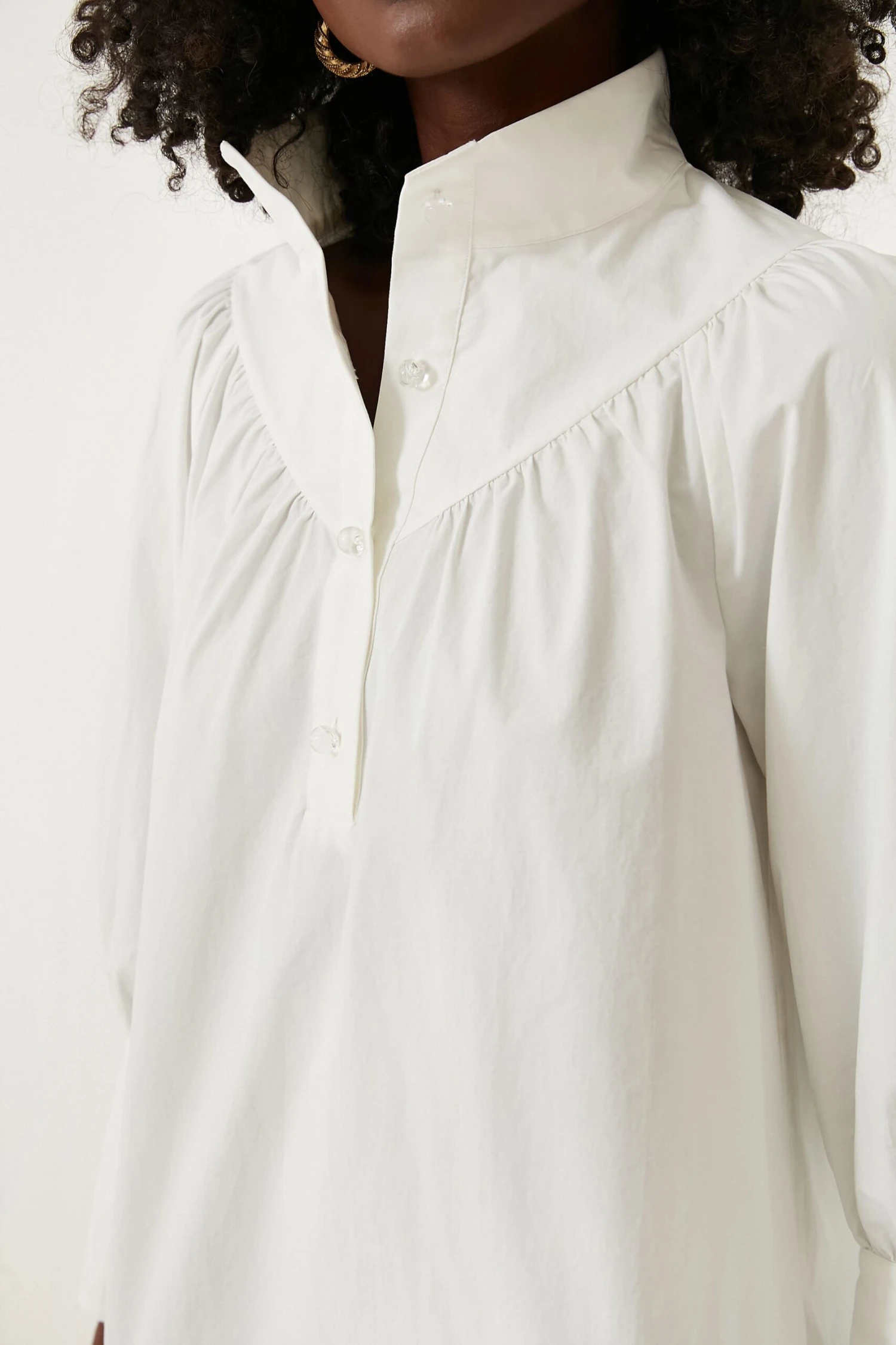 The White Corrigan Blouse is the top that will instantly refresh your wardrobe. This updated classic features a stand collar with a quarter length button front placket and long cuffed sleeves for a chic, modern look. We love wearing this for an easy desk to drinks look, swapping from flats to heels and adding gold accessories for a dash of subtle glam.