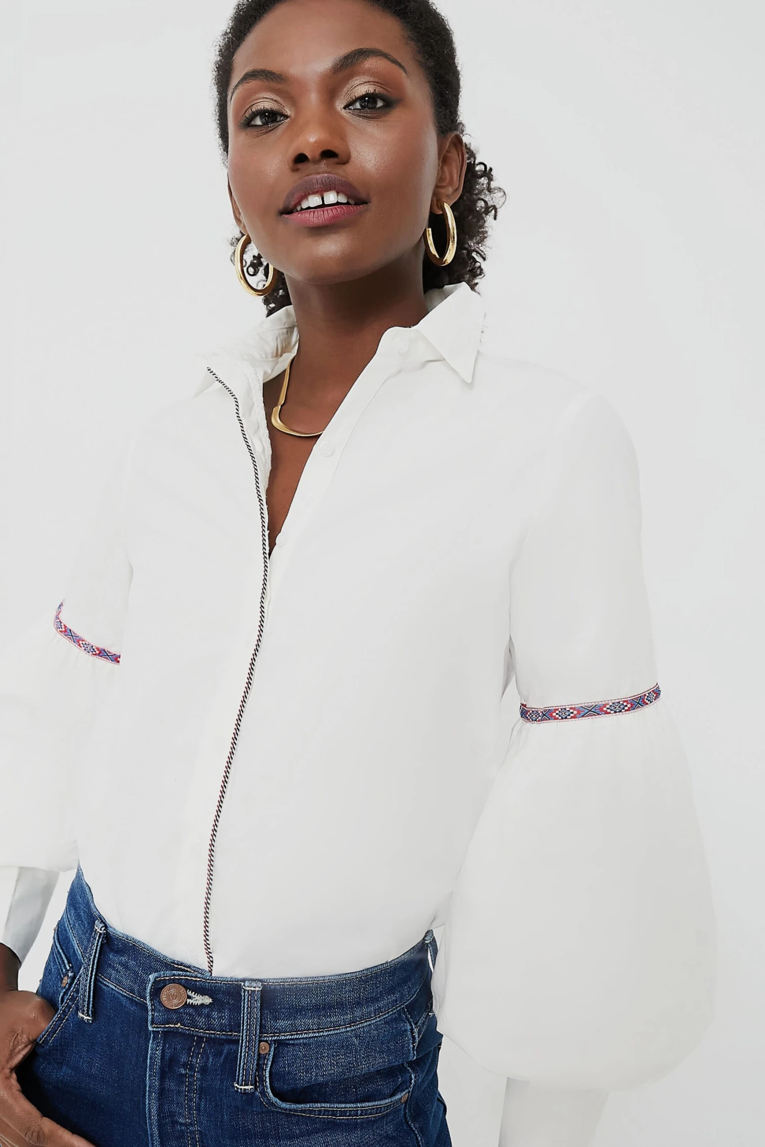 A Tuckernuck fan-favorite back again and better than ever, the Molly Shirt has elevated blouson sleeves and extended slim cuffs for a feminine yet unfussy look. Featuring colorful embroidery at the sleeves and placket, this boho-chic style can be dressed up or down all season long. Add jeans and statement jewelry for a crisp yet natural look.